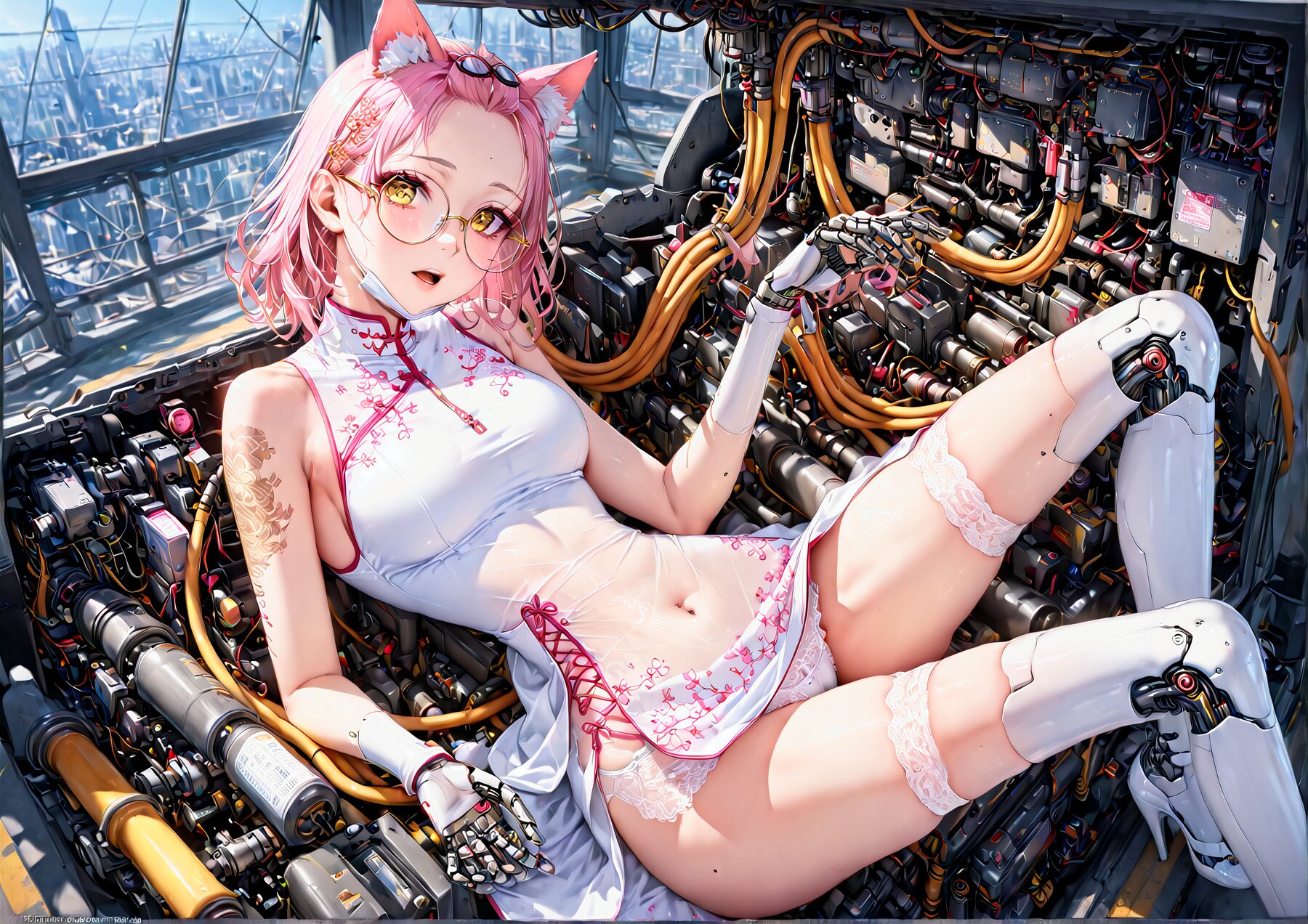 ((extremely detailed CG unity 8k wallpaper,delicate facial features, ultra high res, extremely detailed eyes and face, perfect anatomy:1.2,super fine illustration,)) (detailed ((pink)) short messy hair,) ((lying,on side, closed eyes,clothed,)) 1woman,solo,full makeup,upper body,detailed yellow eyes,botanical gold tattoo,open mouth, (white sleeveless high slit long china dress, long qipao,ao-dai,see through clothes,pink botanical embroidery clothes,) cyberpunk,sf,mechanical body,exposed inside mechanism,finished product,white main musculoskeletal group exposed,blue mechanical joint exposed,black artificial organs visible see through the gap exposed,body and joint inside emit light,exposed wired,red cable conect body sockets,pin heels, (large barcode printed arm and leg,large QR code printed shoulder and arm,long english text printed clothes and body,) cat ears,prosthetic leg,prosthetic hand, (clothes reflecting light,caustics,deep shadows,faint light,(photorealistic,)) gleaming skin, <lora:DetailedEyes_V3:0.66> detailed eyes, <lora:add-detail-xl:0.61> misc, <lora:robo_toyo:0.75> no humans, science fiction, scenery, blurry, industrial pipe, cable, realistic, robot, ground vehicle, motor vehicle, vehicle focus, english text, ceiling light, light, mecha, depth of field, ceiling, solo, still life <lora:circle-glasses_v1.1:0.67> ((circle-glasses, glasses, round_eyewear )) <lora:bangs_pinned_back-xl-pony-v1-000008:0.69> breasts, blush, bangs pinned back, forehead, holding hair <lora:DetailedPerfect_hands_r1:0.63> detailed hands, perfect hands, solo, fingernails, realistic, semi-realistic hands, gradient, palms, outstretched hand, fingers <lora:add-detail-xl:0.61> portrait, <lora:legs_detailed_2.0:0.66> detailed_legs, legs, <lora:jawmaskXLv1:0.57> jawmask, mask, mask pull, surgical mask ,spring rider, <lora:robolady:0.81> robotlady <lora:better panties-v1:0.61> lace-trimmed panties, white panties, close-up, thighhighs, lace trim,
