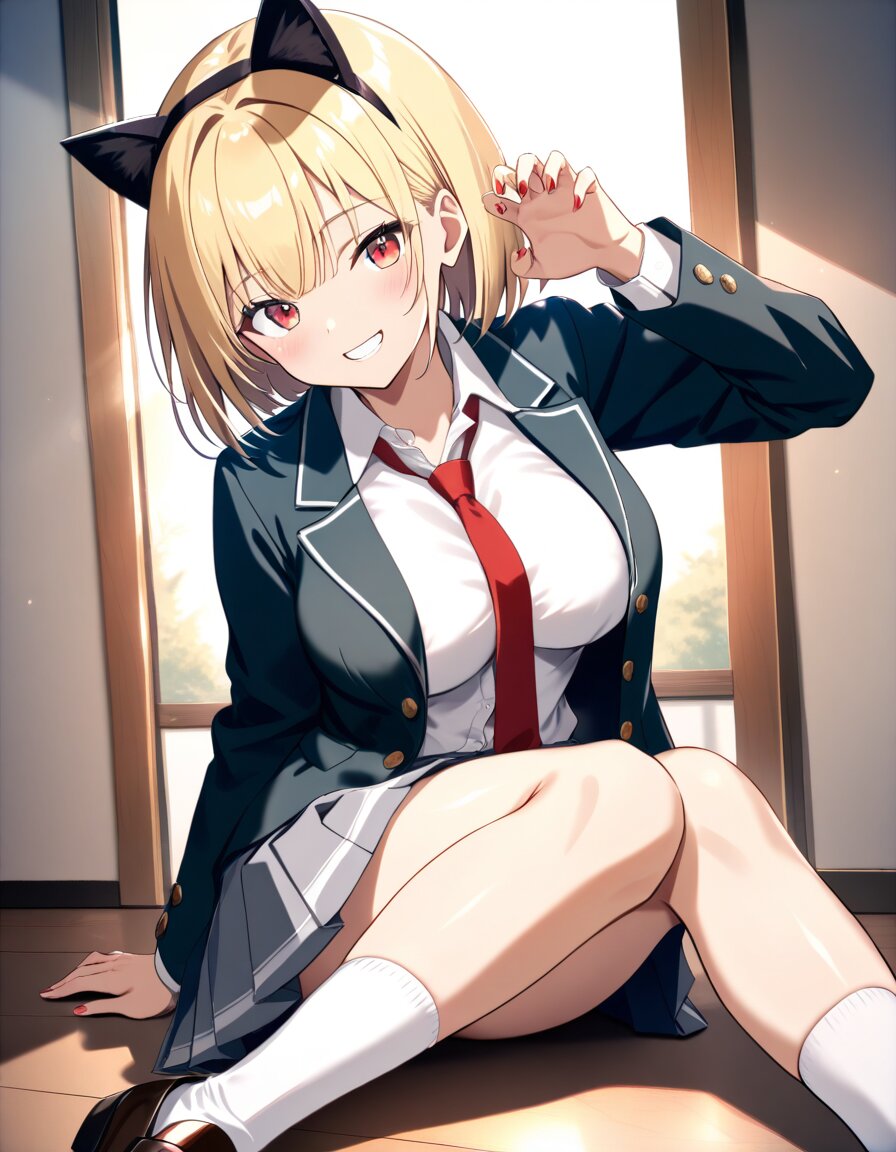 1girl, solo, short hair, blonde hair, straight hair, red eyes, large breasts, smooth skin, fake animal ears, cat ears, claw pose, smile, school uniform, (medium green-gray blazer, white blouse slightly unbuttoned, red necktie loosely tied, gray pleated skirt, white high socks, oxford shoes), masterpiece, best quality, high quality, absurdres