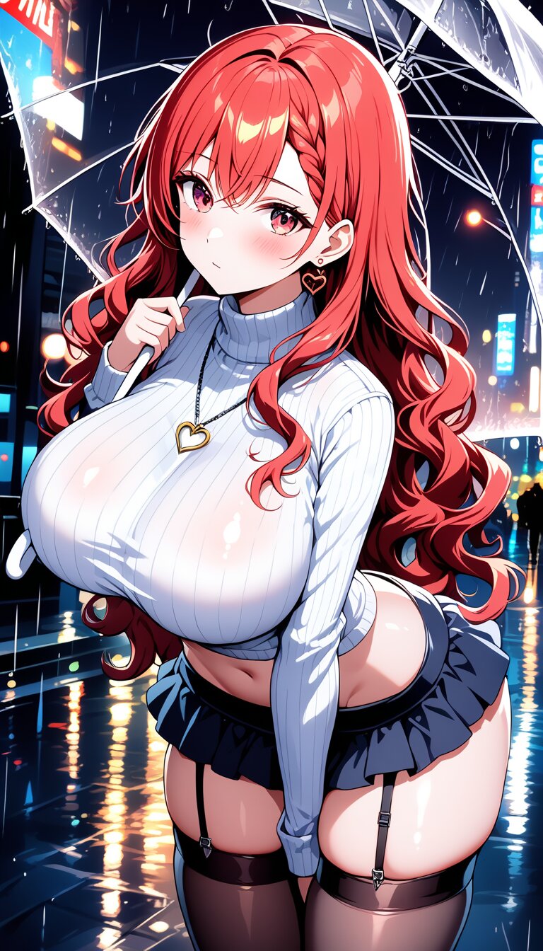 masterpiece, best quality, ultra detailed, hires, 8K, Cinematic lighting, 1girl, solo, holding umbrella, standing, legs together, turtleneck sweater,ruffled mini skirt,wavy hair, [huge breasts]++, hanging breasts, curvy, heart necklace, heart earrings, long sleeves, midriff, garter straps, black thighhighs, skindentation,tall, long straight hair, [shiny skin]++, night, outdoors, rain,city, city lights, building, cowboy shot, expressionless, blush, closed mouth,