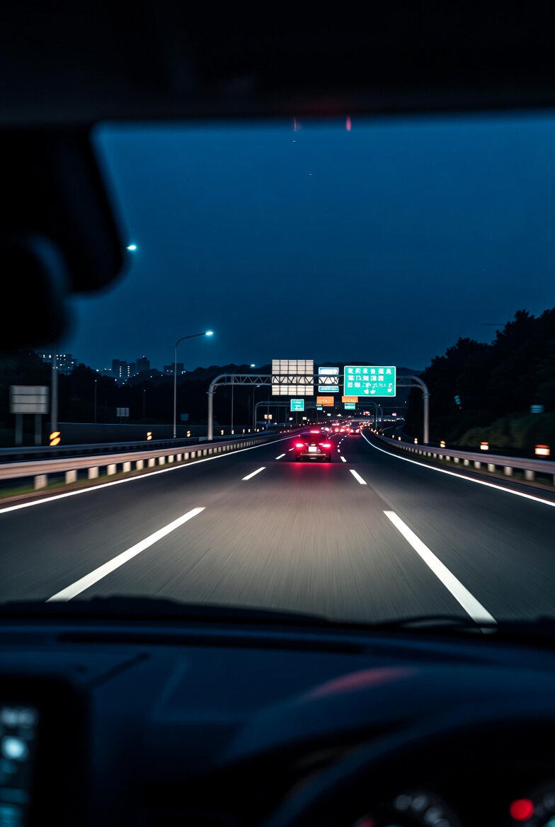 乗用車の運転席から見た夜の高速道路のイラスト。前方には先行車のテールランプ。道路を照らす照明や標識が配置されている。日本の高速道路。深夜で交通量はとても少ない。