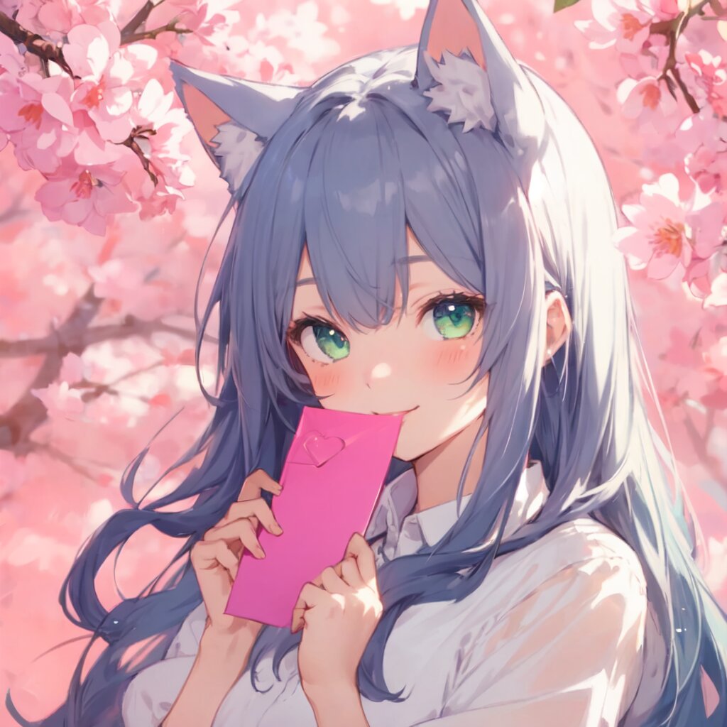 masterpiece, best quality, 1girl, kawaii, solo, long hair, looking at viewer, smile, blush, shirt, blue hair, green eyes, hiding mouth with a white envelope, animal ears, white shirt, upper body, cat ears,