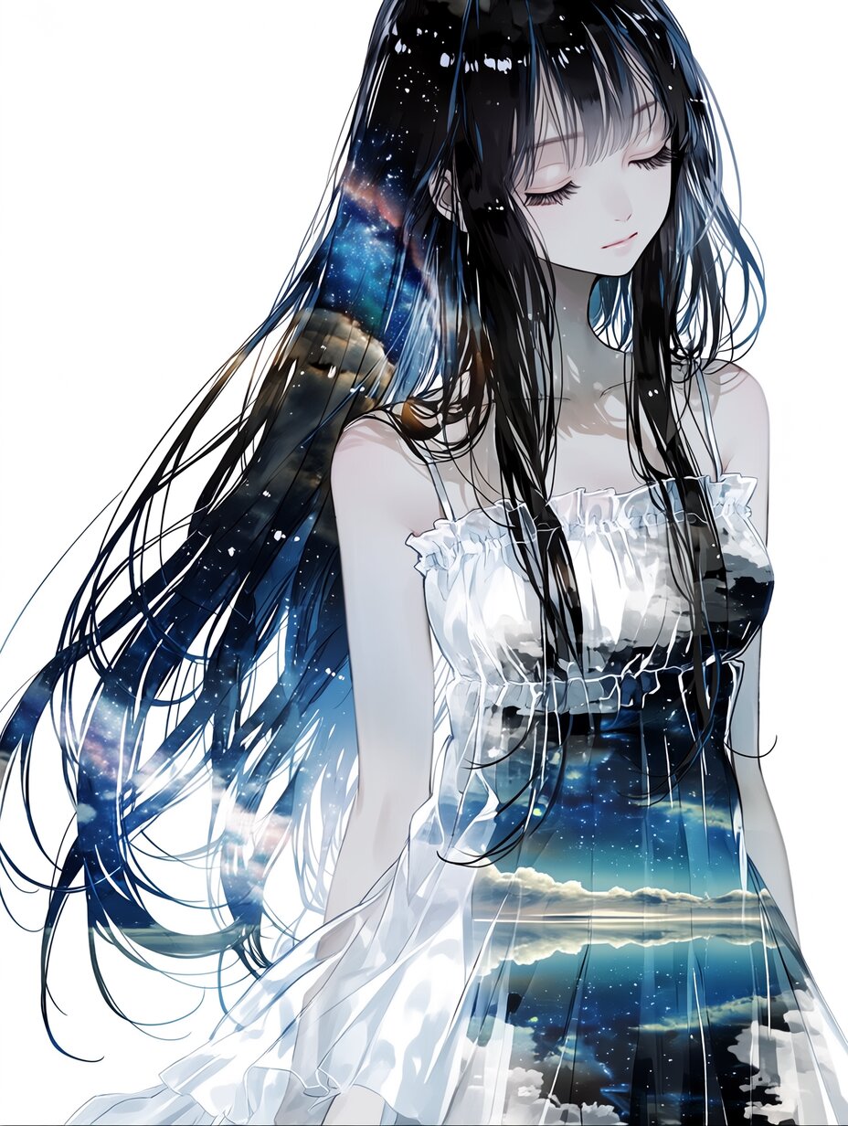 A woman of breathtaking beauty, long black hair and a white dress, double exposure, the starry sky reflected in both her hair and her dress.
