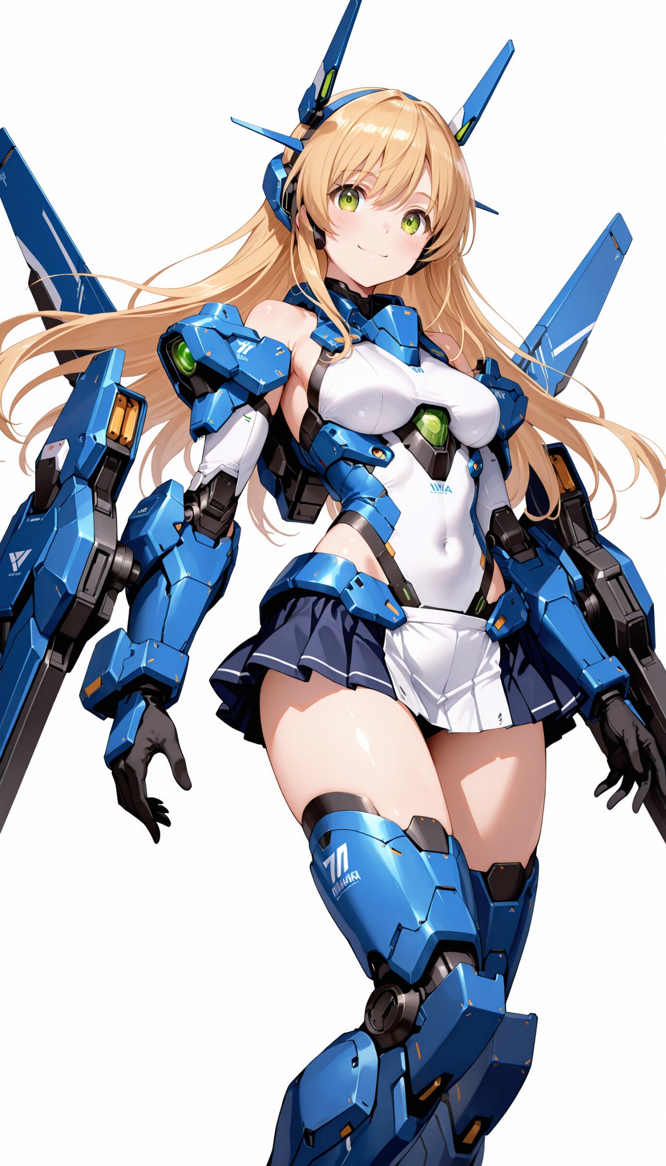 1girl, ((white background)), ultra detailed 8k cg render, masterpiece, high resolution, extremely detailed, mecha musume,mecha shoulder, mech leg, headgear, mecha armor, ((mini skirt)),long blonde hair, dropping green eyes, smile, dynamic posing,