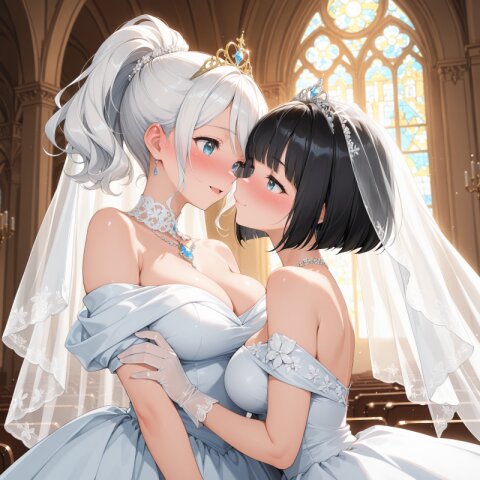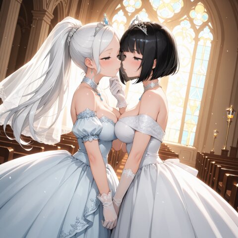 Masterpiece, highest quality, amazing quality, very beautiful, intricate skin detail, captivating high resolution, exquisite detail, 8K, (beautiful and large breasts), beautiful woman, black hair, ponytail, black dress, ball gown dress, long black gloves, facial expression (calm expression), full view of woman, church (background), night (moonlight streaming in), only one woman depicted, with bangs, cinematic lighting, Dutch angle,