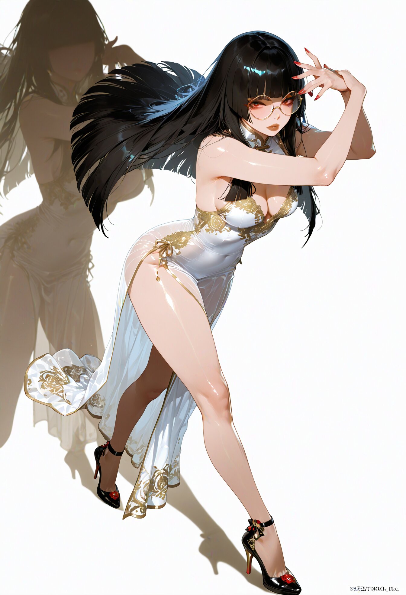 (ultra high res:1.2100000000000002), (extremely detailed CG:1.2100000000000002), (16k:1.2100000000000002), (dynamic shadow:1.2100000000000002), (dynamic lighting:1.2100000000000002), (dynamic pose:1.2100000000000002), (dynamic angle:1.2100000000000002), (perfect anatomy:1.3:1.2100000000000002), heavy makeup, contrapposto, ankle strap pin heels, small breast, embroidery, black hime cut, blunt bangs, blunt ends, red nails, mole, mole under eye, simple background, white background, laxury pelvic curtain long dress, see-through silhouette, circle-glasses, glasses kk sexybody 01, fingernails, looking at viewer, cleavage, black footwear, high heels, breasts, full body, embroidered dress, white dress, dress, gold trim, see-through skirt layer, brown lips, jewelry, (official art:1.2100000000000002), highres <lora:light_see:0.67> <lora:CMN(Pony)0.1v:0.78> <lora:circle-glasses_v1.1:0.71> <lora:kk_sexybody_01:0.65> <lora:kk_sexybody_02:0.6>