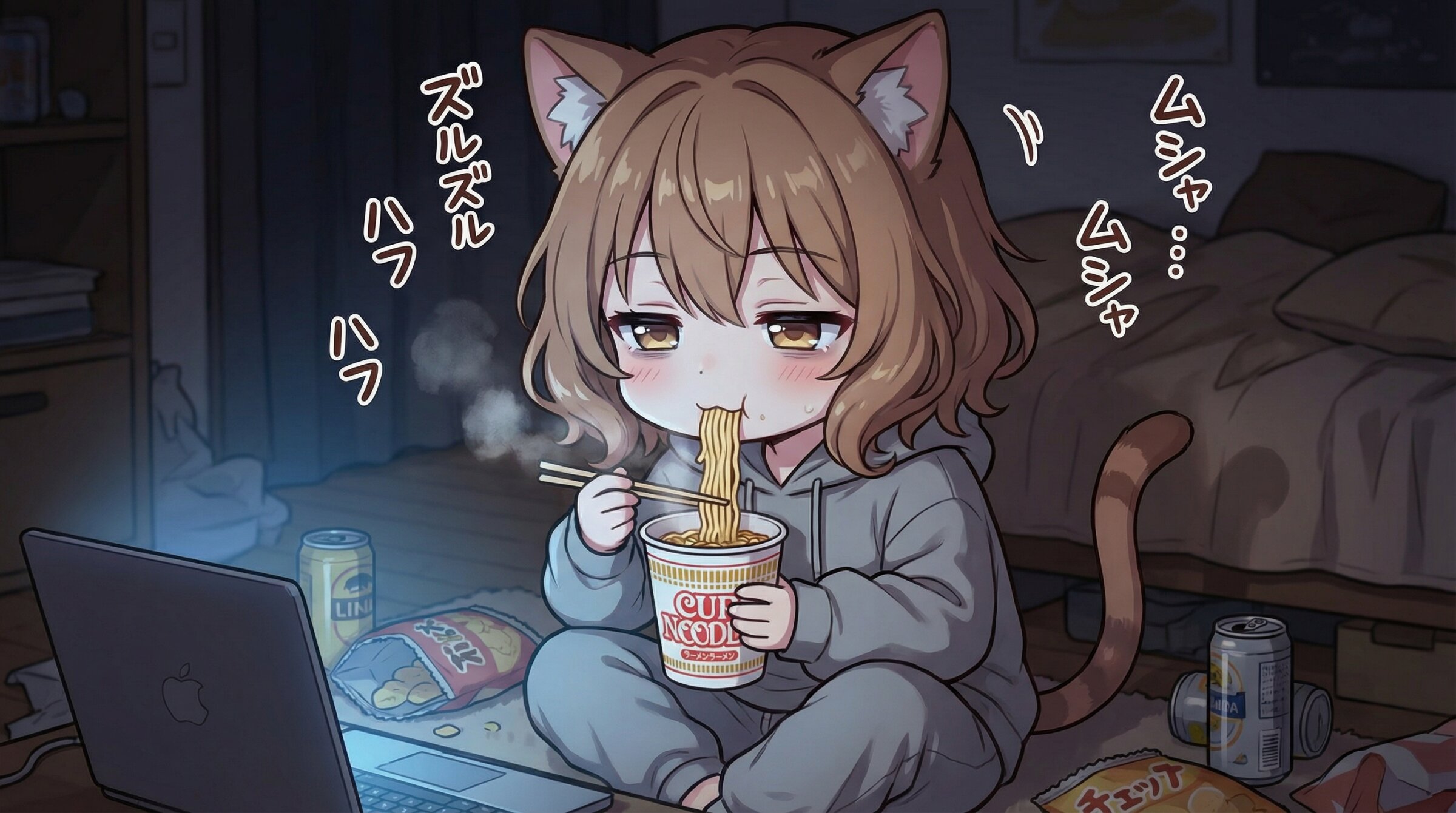 Use the uploaded image as the absolute visual reference for the character's face. Do not deviate from the original design. 深夜に背徳的な雰囲気の食事シーン。 夢中になって幸せそうに食べている。 部屋にひとり。わずかに興奮している。 half-closed eyes, heavy-lidded gaze, glossy eyes, soft shadow under eyes, 雰囲気に合ったエフェクト(湯気や画面効果など)。 シチュエーションに沿った清潔な衣装。 オノマトペはすべて日本語。