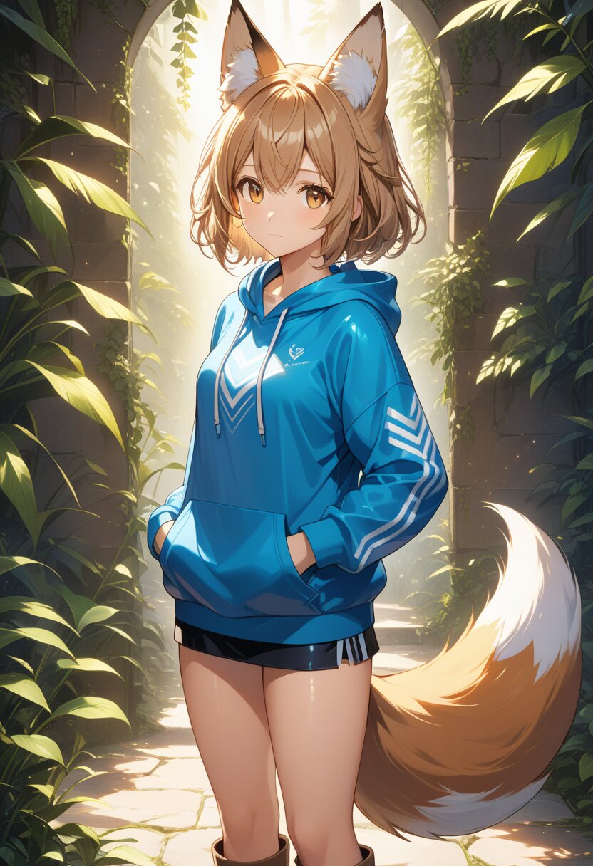 (high resolusion,illustration,ultra detailed 8k art,extremely detailed CG,official art,clothes reflecting light,detailed shiny skin,detailed background:1.3), ((highly detailed beautiful face and eyes),anime_style, fox_ears, girl, light_brown_hair, double_eyelids, long_eyelashes, fluffy_tail, hoodie, miniskirt, long_boots, sweatshirt_texture, soft_lighting, natural_pose, expressive_eyes
