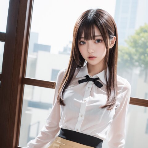 masterpiece, hyper detailed, 8K, hyper detailed illustration,extremely detailed CG, Japanese woman, 23yo, cute, pretty, hyper detailed face, hyper detailed eye, beautiful eye, extremely detailed, medium hair,bangs, thin, tall, perfect anatomy, perfect proportions, extremely detailed body, blouse, short skirt, (thighhighs:1.50), simple background,