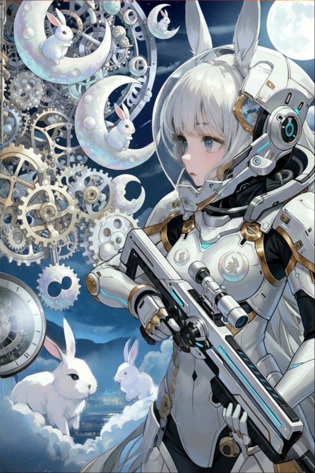 anime style, a cute bunny girl in a detailed futuristic white and gold sci-fi armor, holding a sniper rifle, long white hair, blue eyes, surrounded by a moon kingdom with gears and clockwork mechanisms, multiple crescent moons, fluffy white rabbits, soft glowing clouds, starry night sky, intricate details, dreamy atmosphere, dynamic pose