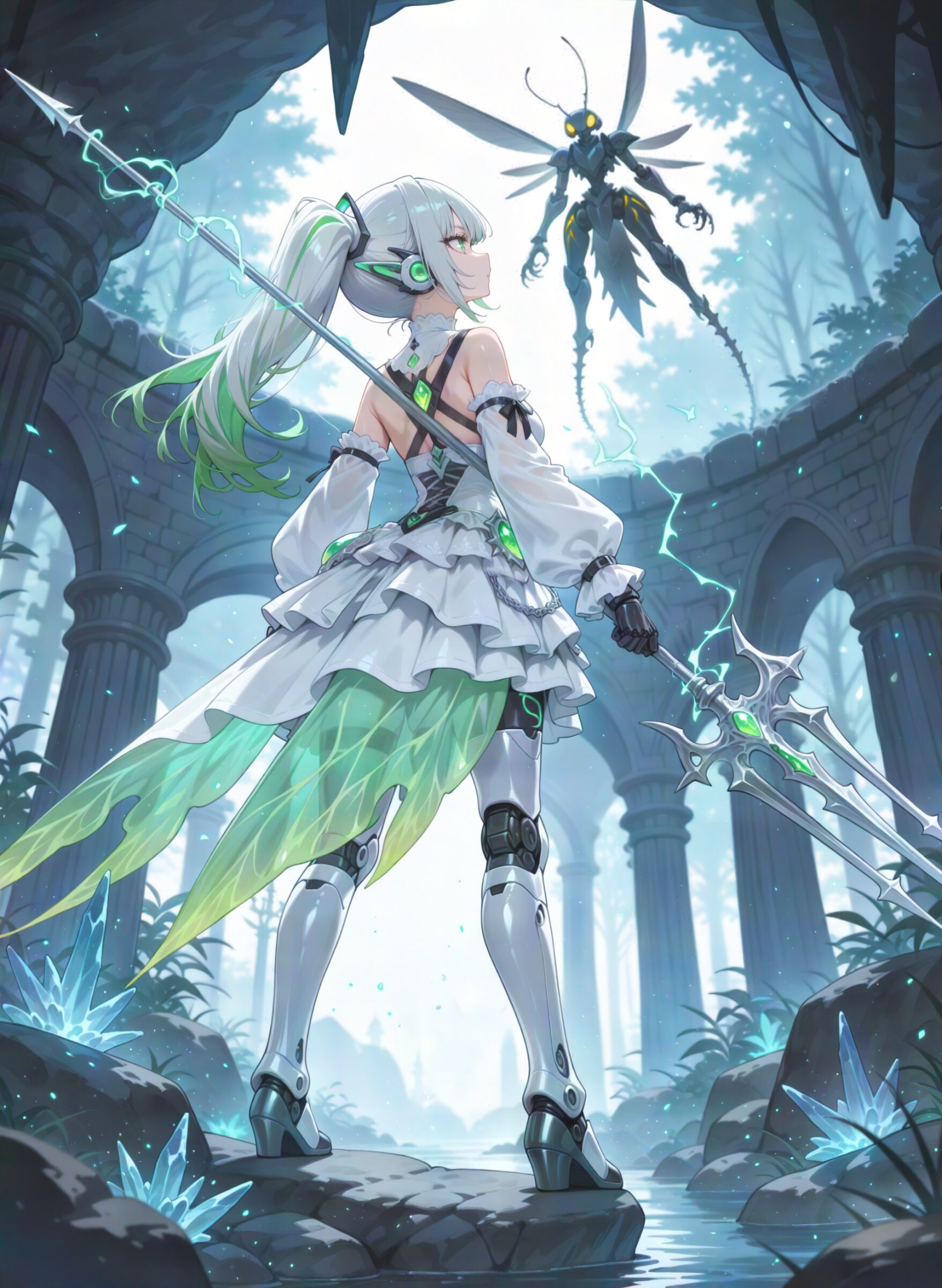 1girl, huge cool trident, (weapon focus:1.2) in hands, holding huge cool weapon mechanism, machine, from side, looking back, facing away, (25 years old:1.0), (medium breasts:1.2), (two-tone hair, grey and ever green hair, shoulder length hair, high side ponytail medium bangs:1.0), (beautiful face:1.1), (clear white small eyes:1.0), green pupils , fighting stance, weapon over shoulder, (mechanical black hands:1.0), black robot ears, , (mechanical white legs:1.1), white mechanical thighs, neon trim, medieval times fantasy world, (cybernetic gynoid:1.0), (mech suit:1.0), (white gothic cuirass:1.0), (robot joints:1.0), (white gorgeous modest wizard's dress skirt:1.1), , glossy silver body with metallic luster cyborg, bare shoulders, (Decorative embroidery:1.0), (white gorgeous dress:1.1), (overskirt:1.0), (white sleeve:1.2), electrokinesis, (battle:1.2), duel , (looking away:1.0), from side, (huge silver silhouette of praying mantis,serious monster silhouette:1.2), , colorful gem, crystal, cave, rock, stone, nature, mud, blurry background, super fine concept art, hard surface, 8K, masterpiece, best quality, amazing quality, very aesthetic, absurdres, professional art lots of details, , overexposure, shiny-glistening, (watercolor style:1.0), (pastel color style:0.5) 4ur4_illu,shiny, glowing, glowing particles, glowing light particles, light particles, <lora:noline (1):1.0> <lora:sdxl2-flat2-512b:0.0> <lora:facelightup_xl_v10:0.5> <lora:V2_yakumo_alchemy:0.5> <lora:Aura_illu:0.1>