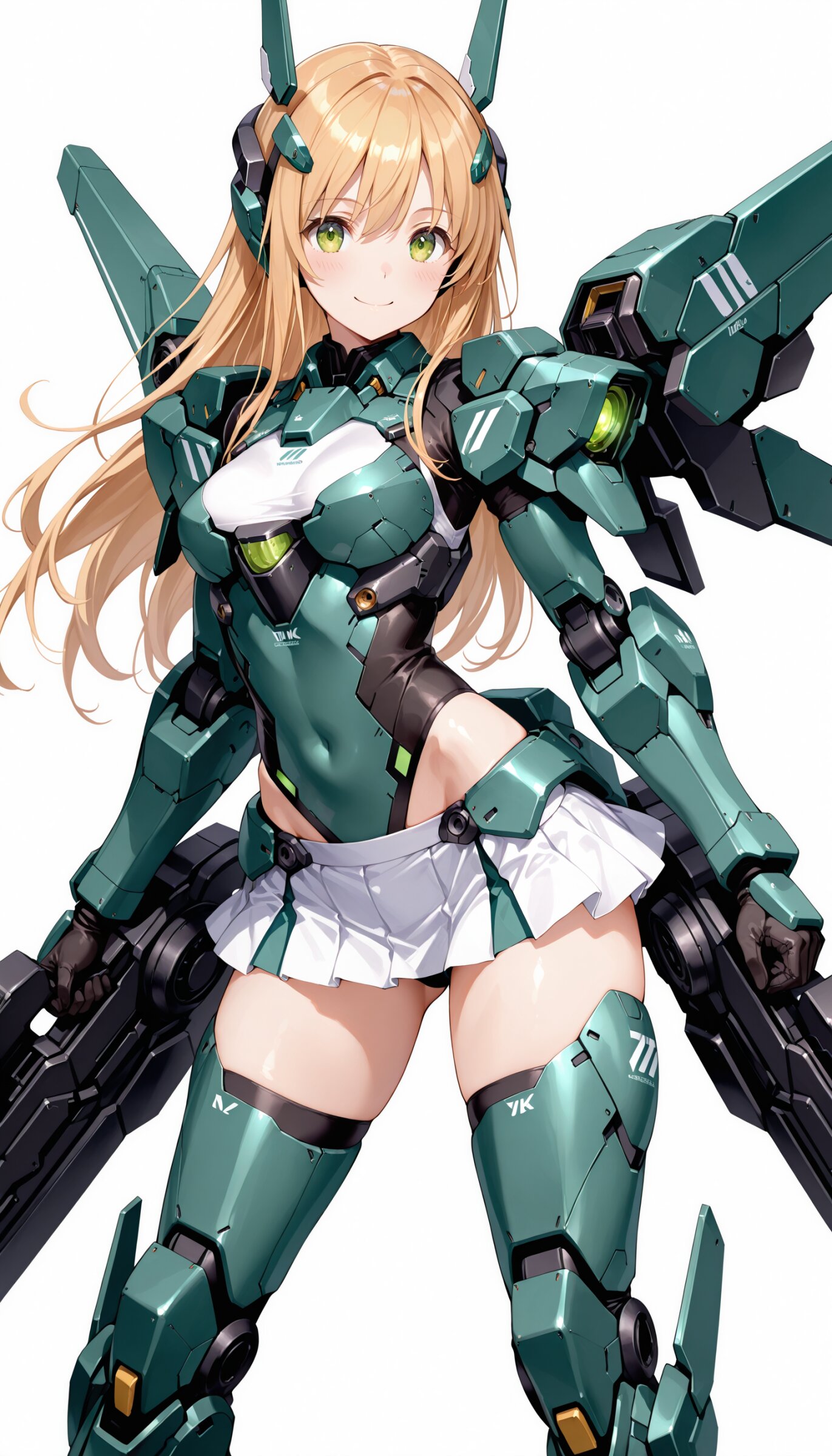 1girl, ((white background)), ultra detailed 8k cg render, masterpiece, high resolution, extremely detailed, mecha musume,mecha shoulder, mech leg, headgear, mecha armor, ((mini skirt)),long blonde hair, dropping green eyes, smile, dynamic posing,