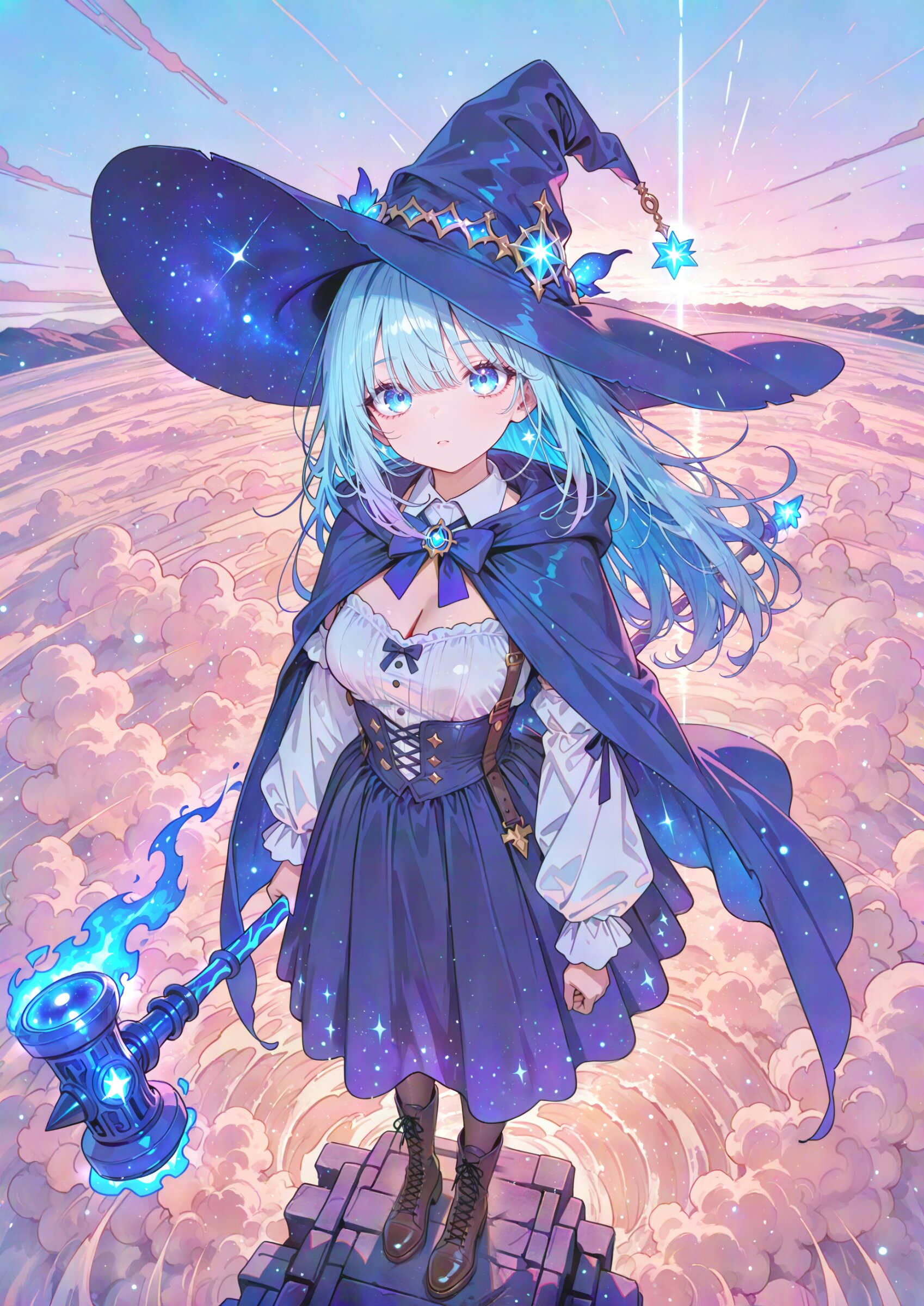 (fisheye,fisheye lens angle:1.0), (from above,looking up:1.0) looking at viewer, 1girl, witch girl, blue eyes, beautiful iridescence eyes, beautiful detailed eyes, beautiful light blue hair, long bangs, long disheveled beautiful hair, first-rate female bodies, perfect body, beautiful breasts, framed breasts, cool face, (Beautiful Lips:0.7),, long hair, (stylish beautiful witch dress:1.2), detached sleeves, (cute blue and dark blue witch girl costume:0.9), (white blouse:1.3), bow tie, witch long skirt (overskirt:1.1) blue cloak, (blue galaxy witch hat:1.1), lace-up boots on feet, stockings and suspenders,, mysterious face, expressionless,disappointment , wind magic, sandstorm, floating hair, outflow boundary, floating huge hammer, flaming weapon, dim lighting, pastel colors slategray theme, winter atmosphere, , masterpiece, best quality, amazing quality, very aesthetic, absurdres, newest, you can add scenery, (volumetric lighting), To make the background more distinctive. professional art lots of details, , overexposure, shiny-glistening, (watercolor style:1.0), (pastel color style:0.0) 4ur4_illu,shiny, glowing, glowing particles, glowing light particles, light particles, <lora:noline (1):1.0> <lora:sdxl2-flat2-512b:0.0> <lora:facelightup_xl_v10:0.5> <lora:V2_yakumo_alchemy:0.5> <lora:Aura_illu:0.1>