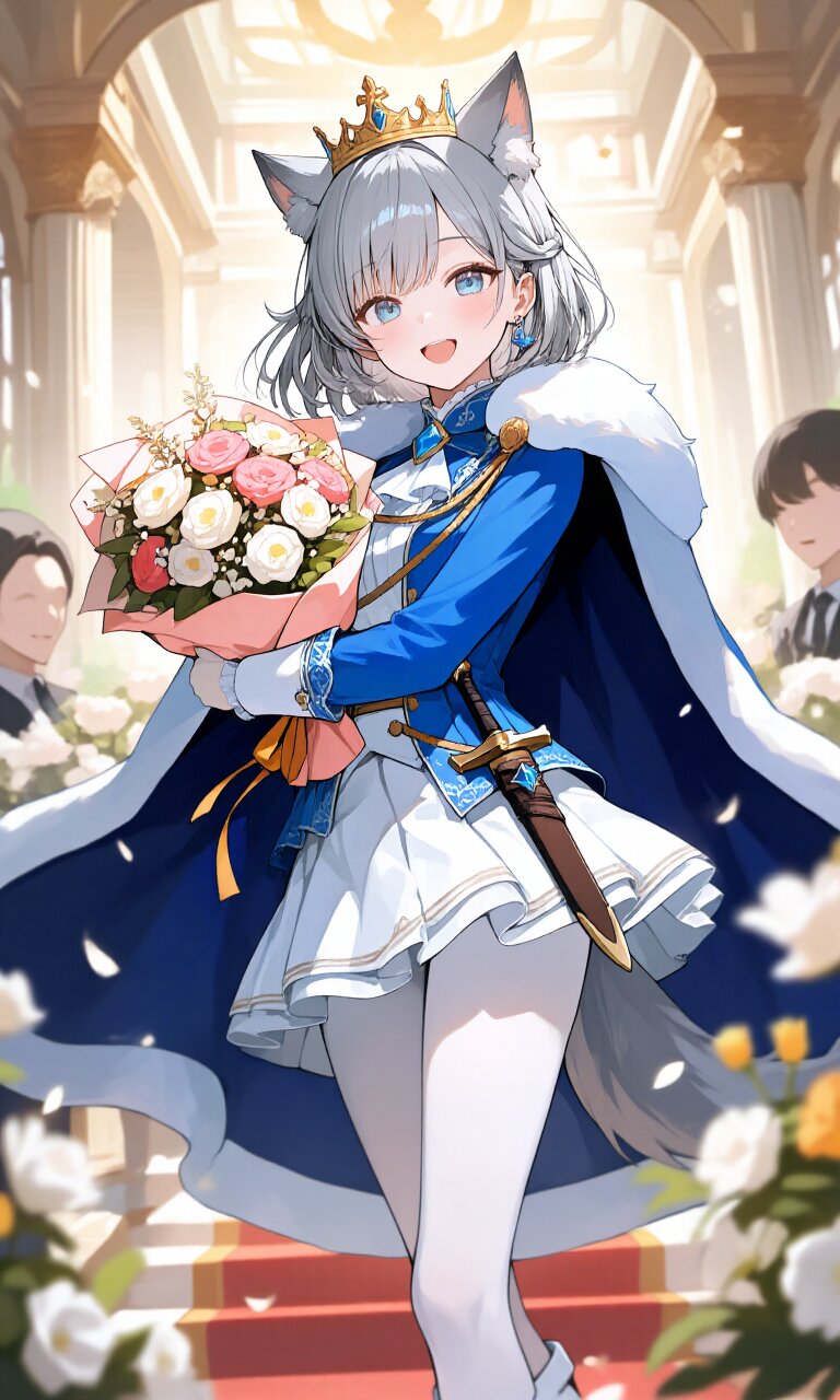 1girl, solo, animal ears, wolf ears, wolf tail, short gray hair, blue eyes, floating hair, small breasts, detailed face, cute face, detailed skin, detailed hair, detailed clothes, masterpiece, best quality, insanely detailed, beautiful, 16k, Prince Charming, wearing a (Blue luxurious Prince costume:1.5) with long sleeves, a (luxurious Darkblue Cape:1.4), a (luxurious White mini skirt:1.3), and (White luxurious Tights:1.3). She has a (dagger on waist:1.3) and a (luxurious crown on head:1.3), along with (luxurious White gloves:1.2). She looks happy and proud, smiling while (holding a bouquet in hand:1.5) at a birthday celebration. The scene is heartwarming, set in a luxury ball room within a (Palace:1.2), adorned with lots of flowers and soft lighting. The atmosphere is light, dreamy, and cozy, blending romantic and classic academia aesthetics. The background features (Japanese traditional architecture:1.2), and she is (surrounded by friends:1.8), creating a warm and joyful ambiance. The overall style is highly detailed, with a focus on intricate textures, soft bloom effects, and a harmonious color palette.
