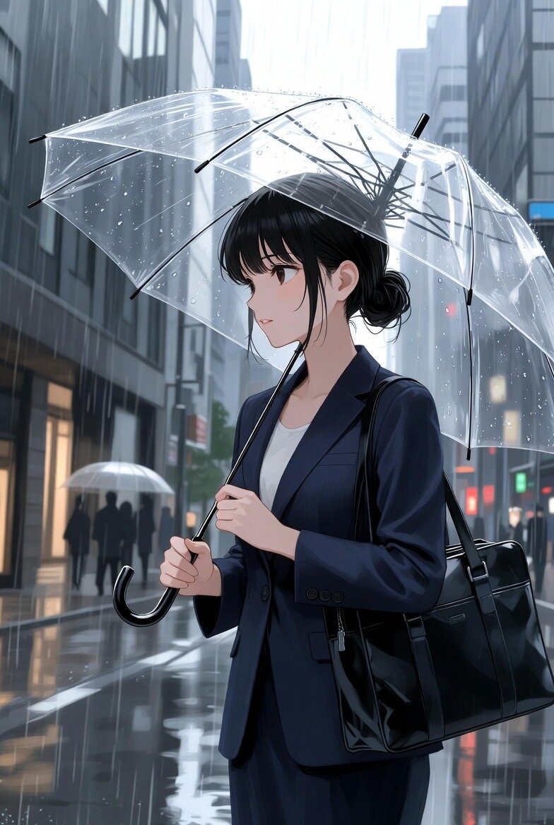 日本人女性25歳のイラスト。ビジネススーツを着ている。雨の中、傘をさして通勤している。背景は東京都心のビジネス街。