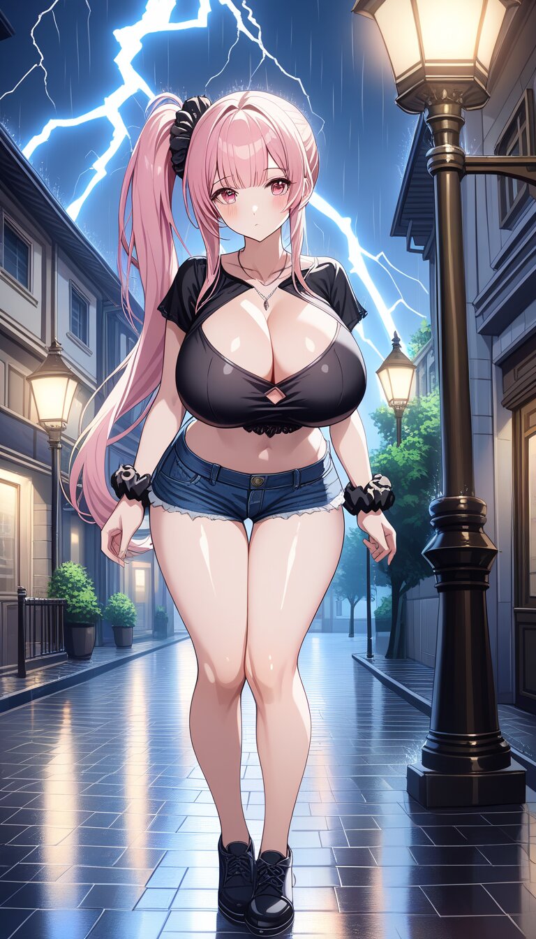 masterpiece, best quality, ultra detailed, hires, 8K, Cinematic lighting, 1girl, solo, standing, legs together, arms at sides, a large diamond cutout on the chest, blouse, denim shorts, shoes,high side ponytail, [huge breasts]++, hanging breasts, curvy, cleavage,necklace, short sleeves, wrist scrunchie, hair scrunchie, midriff, bare legs, tall, long straight hair, [shiny skin]++, town, lamppost, rain, lightning, outdoors, full body, expressionless, blush, closed mouth,