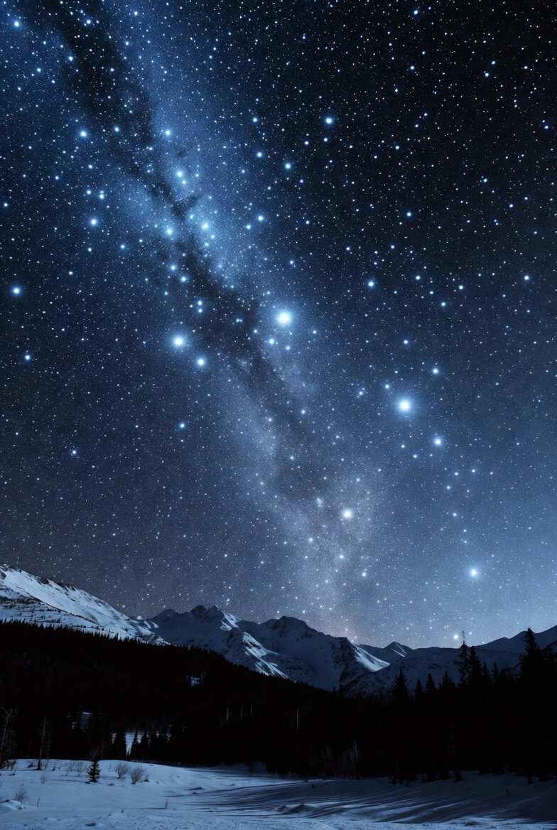 郊外の夜空における満天の星のイラスト。天の川や有名な星座の配置が分かるほどはっきりとした星空。地面の近くには雪化粧した山や森。