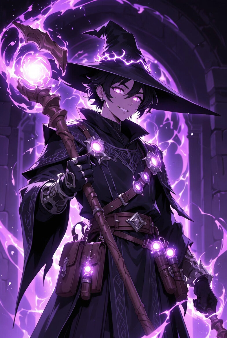 Cool Mage from Wizardry video game, equipped with the stuff glowing with mystical purple energy, wearing detailed black robe, confident smile, fantasy RPG style character portrait, side view,dungeon background, highly detailed, sharp lines, vibrant colors, dynamic composition