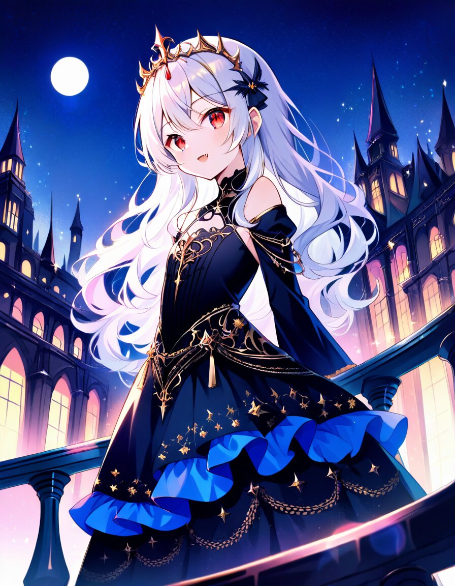 masterpiece, best quality, amazing quality, very aesthetic, newest, absurdres, highres, 1girl, solo, loli, petite, flat chest, youthful, cute, vampire princess, gothic fantasy, silver hair, semi-long hair, soft wavy hair, natural skin tone, mesmerizing red eyes, red eyes, fangs, vampire fangs, pure white flowing tiered dress, elegant dress, ornate dress, luxurious dress, sophisticated, predominantly white fabric, traditional Japanese patterns, red wave patterns, gold accents, delicate tiara, subtle gothic accessories, frills, lace, standing on balcony, looking up, gazing at moon, head tilted back slightly, gentle serene expression, soft smile, fang peek, midnight, night sky, full moon, large prominent moon, moonlight illumination, stars, ethereal glow, cool blue tones, ancient castle balcony, stone railing, wide spacious balcony, distant gothic architecture, below: sparkling town lights, twinkling city lights, bokeh city glow, glittering night cityscape, distant town lights sparkling like stars, magical light particles, glowing windows, romantic atmosphere, from slightly above, aerial fixed view, high angle shot, static camera perspective, floating viewpoint, detailed foreground and background