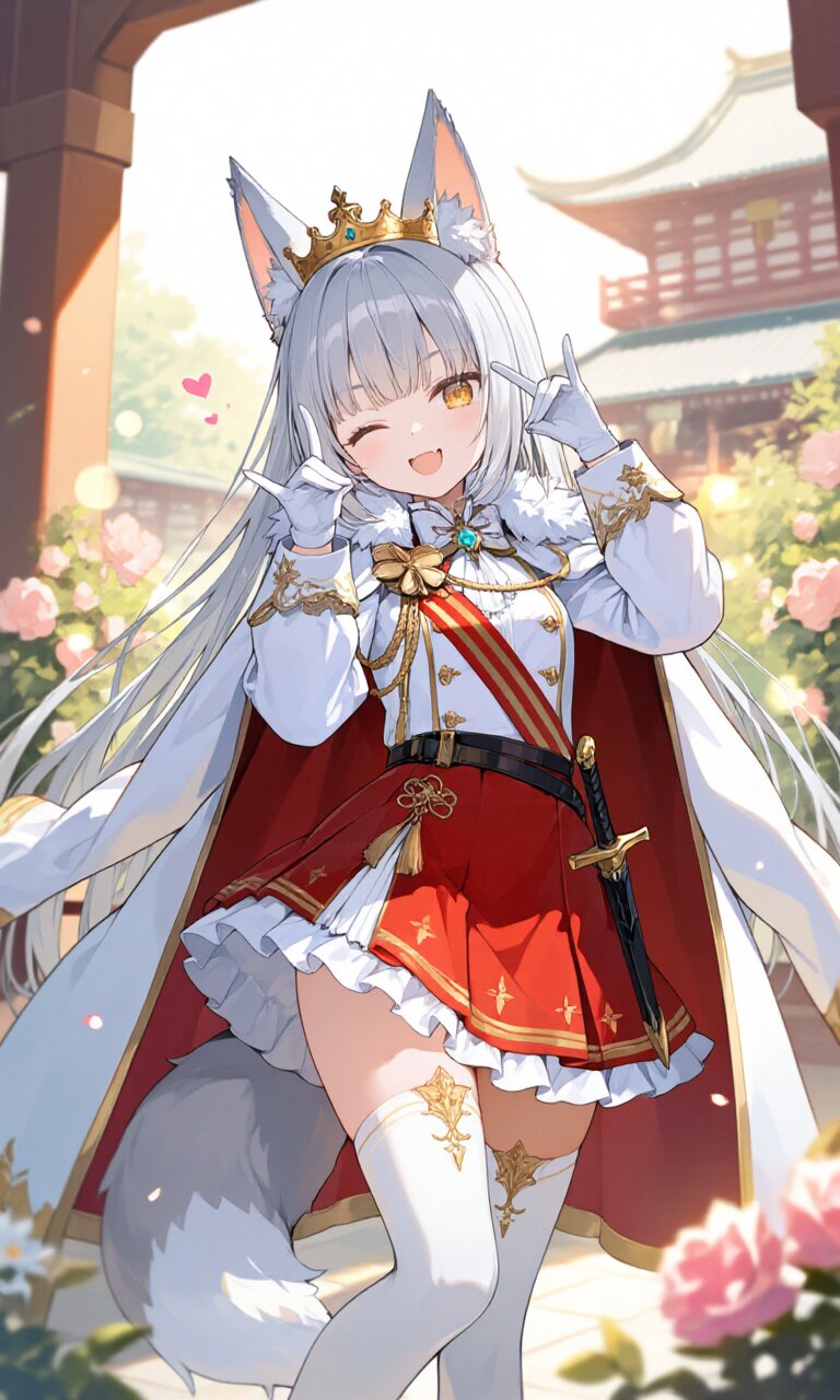 A beautiful silver-haired fox girl with ((very long hair:1.2)) stands proudly in a sunlit palace courtyard, wearing an elegant (White luxurious Prince costume:1.6) complete with a (luxurious White Cape:1.3) and (luxurious Red mini skirt with frills:1.4). Her hair is perfectly straight and neatly aligned, framing her delicate face with golden eyes that sparkle in the morning light. She has small fangs peeking through her cheerful smile as she strikes a cute pose, one eye closed playfully. Her outfit is immaculately detailed, featuring (luxurious White Thighhighs:1.3), (luxurious White gloves:1.3), and a (dagger on waist:1.3). A (luxurious crown on head:1.4) rests atop her head between her perky fox ears, while her (fox tail under the skirt:1.2) adds a mischievous touch. The background showcases traditional Japanese architecture with blooming flowers, bathed in soft sunlight with lens flare effects. The romantic academic atmosphere combines classic elegance with fantasy elements, creating a light, dreamy mood perfect for a princely character.