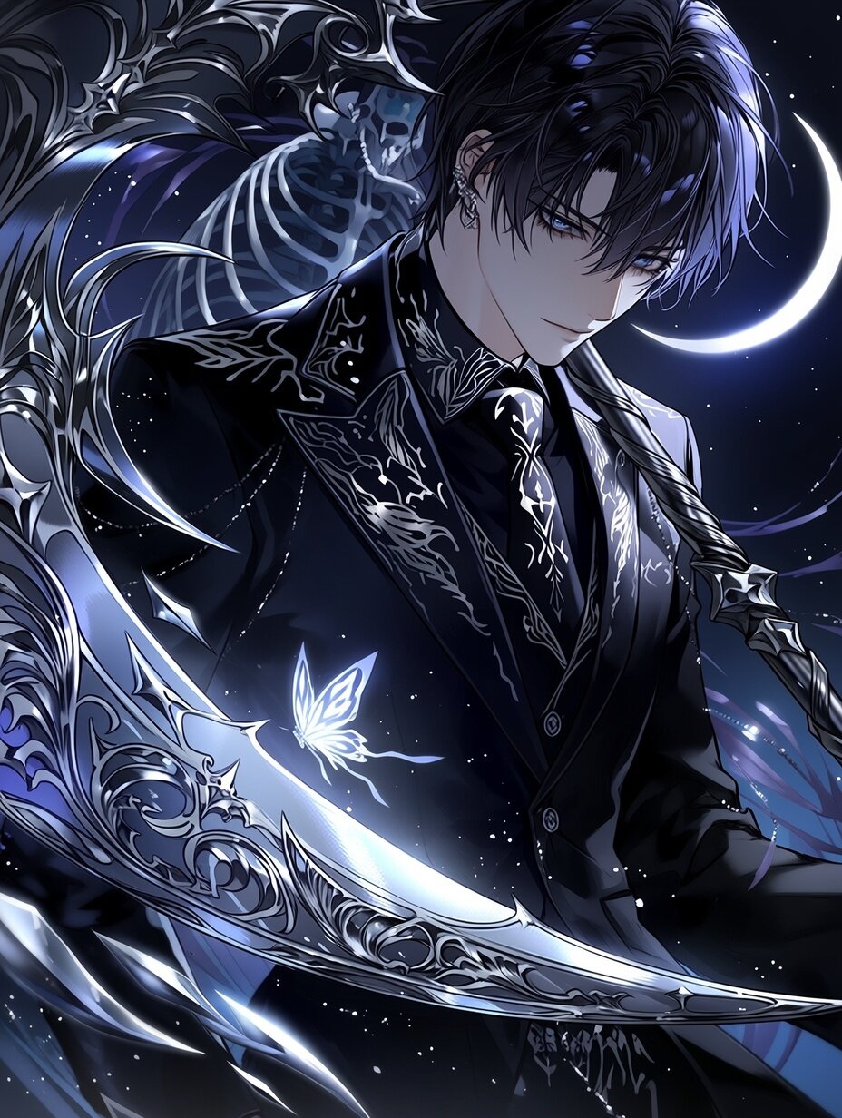 Theme: Night Sky A beautiful night, delicate and captivating anime style. Full body shot. Create an intricate and delicate scene featuring a beautiful, anime style, a too beautiful handsome young man, black silken hair, light at the end of long eyelashes, blue-black eyes, beautiful face and eyes, black suit, a magnificent scythe in his hand, the long, curved blade decorated with intricate silver engravings and wrapped in elegant, gothic patterns. The background features a glowing skeleton and a glowing silver butterfly twinkling in the jet black