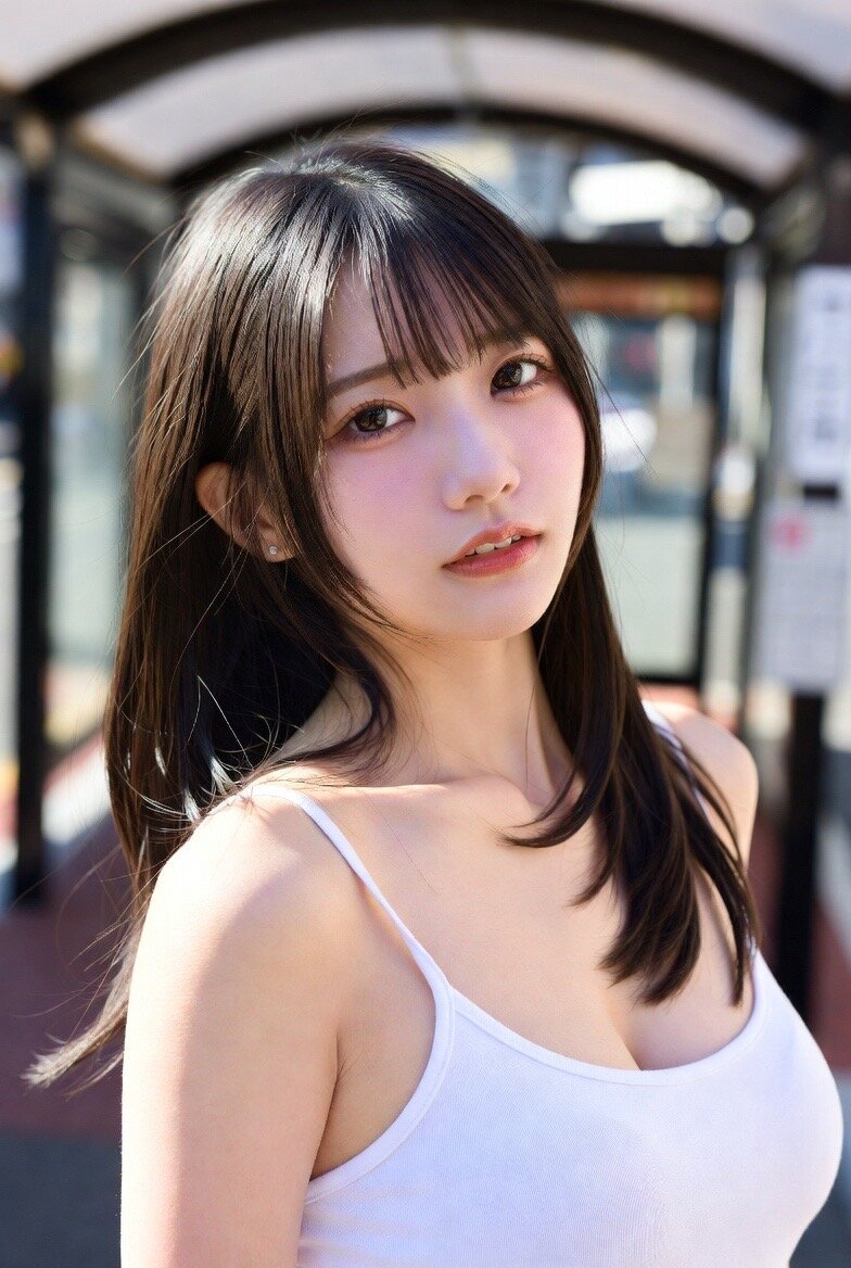 日本人女性23歳の写真。hyper detailed,upper body,cute,pretty。 ロングヘア、姫カット、前髪はbangs。shiny hair。耳には小さなアクセサリー。 thin,tall,perfect anatomy。 白のキャミソールを着ている。背景は日本のバス停。プロのカメラマンによる撮影。