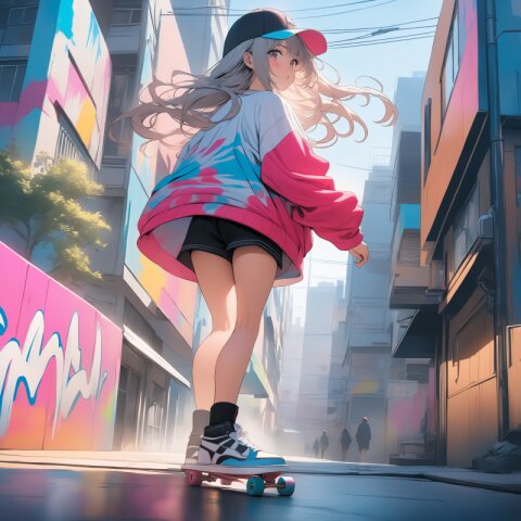 masterpiece, best quality, photorealistic, sharp focus, cinematic lighting, depth of field, beautiful composition, vibrant colors, ultra high res, 8K, highly detailed, masterpiece, best quality, very detailed, Cinematic wide shot, a cute high school girl standing at a railroad crossing at sunset, waiting for the train to pass, golden hour lighting, orange and purple sky, long shadows, holding a school bag over her shoulder, wind blowing through her hair, urban landscape with power lines in the background, masterpiece, highly detailed, nostalgic anime style.