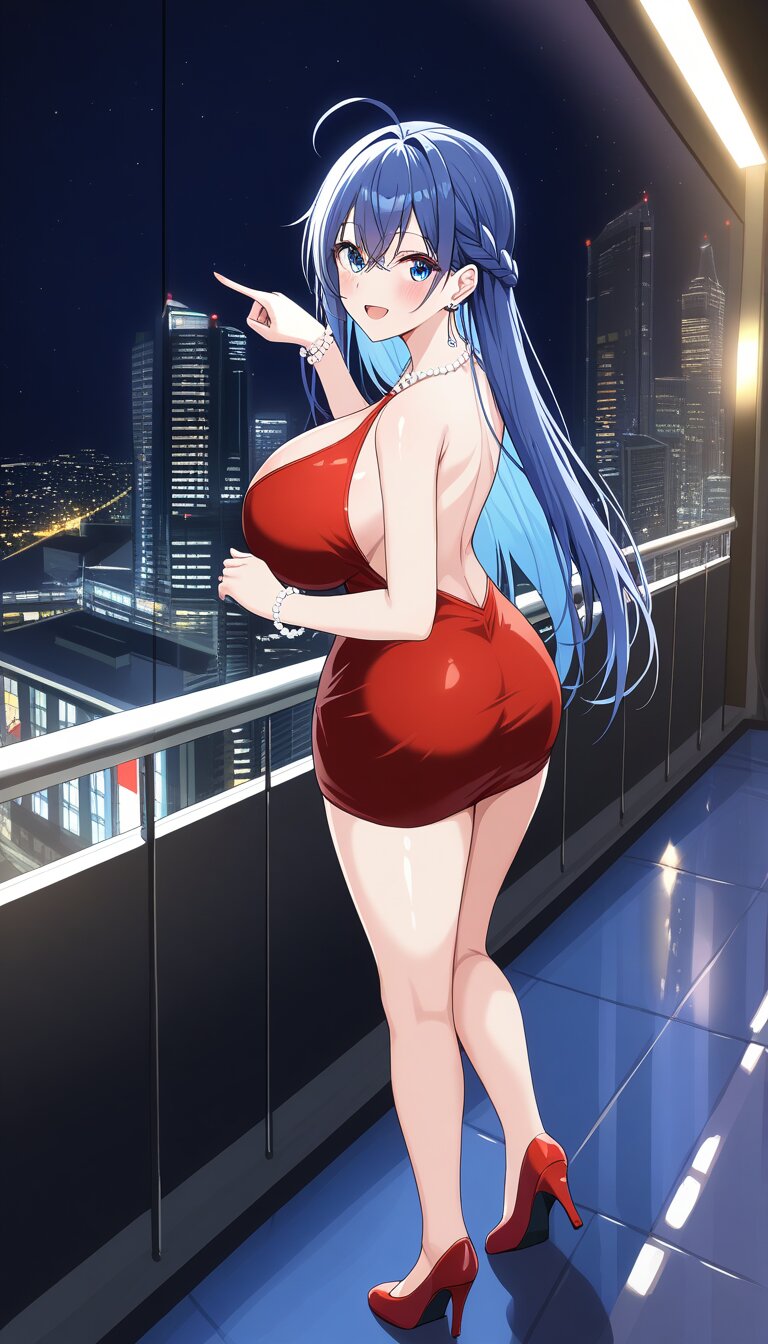 masterpiece, best quality, ultra detailed, hires, 8K, Cinematic lighting, 1girl, solo, looking back, Pointing at the night view, standing, legs together,red backless dress, [huge breasts]++, hanging breasts, curvy, necklace, earrings, pearl bracelet, bare legs, high heels, tall, long straight hair, [shiny skin]++, balcony, night, scenery, city lights, building, full body, from behind, smile, blush, open mouth,