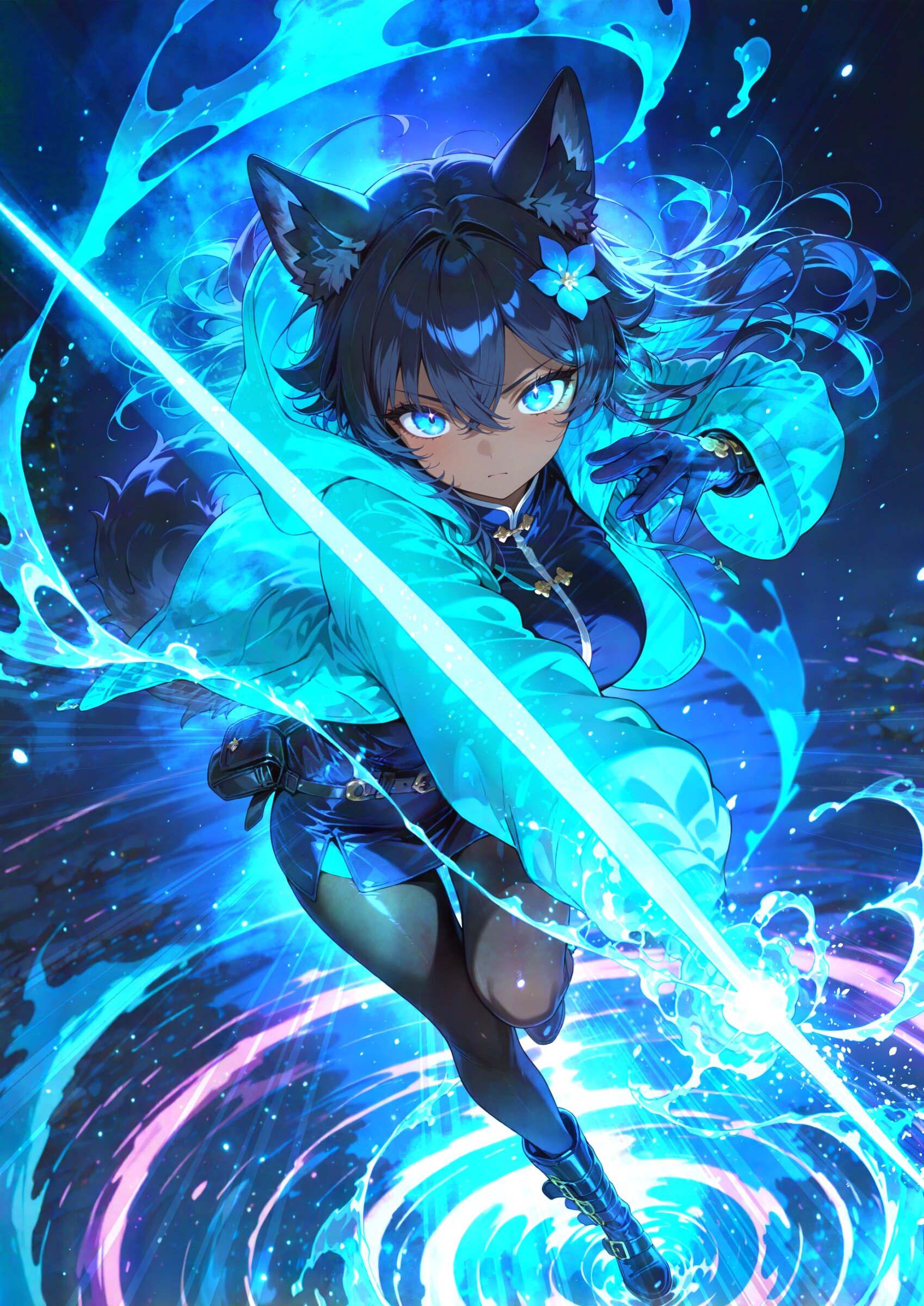 , from above, looking up, from a distance, vanishing point from behind 1girl, black wolf ears, dark skin, young beautiful girl, large breasts, tall, wolf tail, (aristocratic features), (Black Hair:1.2) (disheveled long hair over ears:1.3) messy hair ornament flower, (perfect turquoise eyes:1.3) long eyelashes,, wearing turquoise hood down, winter gloves, black leather miniskirt, belt boots, turquoise hoodie, hooded jacket, winter coat, fur boots, black pantyhose, belt bag,, pale color royalblue gloves, water magic, , kung fu attack, kung fu pose, kung fu action, (swirling energy,energy magic,energy:1.2), winter atmosphere, water magic, holding water lance, reflective liquid, great clear water, reflective water, , looking at viewer, (eye focus:1.1) midair incoming attack, super fine concept art, hard surface, 8K, masterpiece, best quality, amazing quality, very aesthetic, absurdres, professional art lots of details, , overexposure, shiny-glistening, (watercolor style:0.5), (pastel color style:1.0) 4ur4_illu,shiny, glowing, glowing particles, glowing light particles, light particles, <lora:noline (1):1.0> <lora:sdxl2-flat2-512b:0.15> <lora:facelightup_xl_v10:0.5> <lora:V2_yakumo_alchemy:0.5> <lora:Aura_illu:0.1>