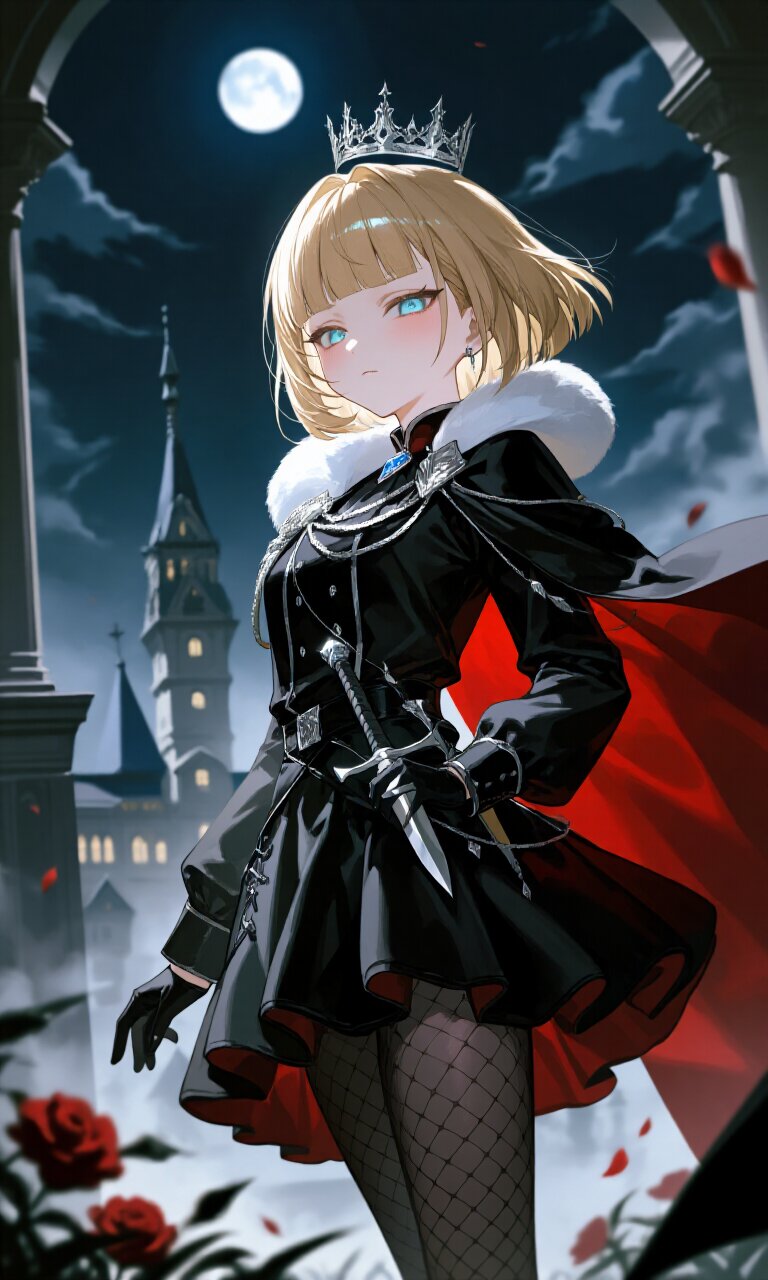 A 15-year-old girl with a bob cut and blunt bangs, her blonde hair framing a delicate face with sharp, glowing blue eyes, looks unamused at the viewer. She wears a (Black luxurious Prince costume:1.6) with long sleeves, a (luxurious Black Cape:1.3) billowing behind her, and a (luxurious Black mini skirt:1.4) paired with (luxurious Black fishnet tights:1.3). Her hands are clad in (luxurious Black gloves:1.3), and a (dagger on waist:1.3) glints subtly. A (luxurious crown on head:1.4) rests atop her head, adding to her regal yet youthful aura. Her pose is cute yet composed, standing outside a grand palace with futurism architecture, blending romantic and classic academia styles. The dark atmosphere is hazy, lit by the moon peeking through clouds, with scattered flowers adding contrast to the night’s darkness. The scene is insanely detailed, from her flawless skin and intricate hair strands to the rich textures of her attire and the gothic ambiance. Masterpiece, best quality, 16k.