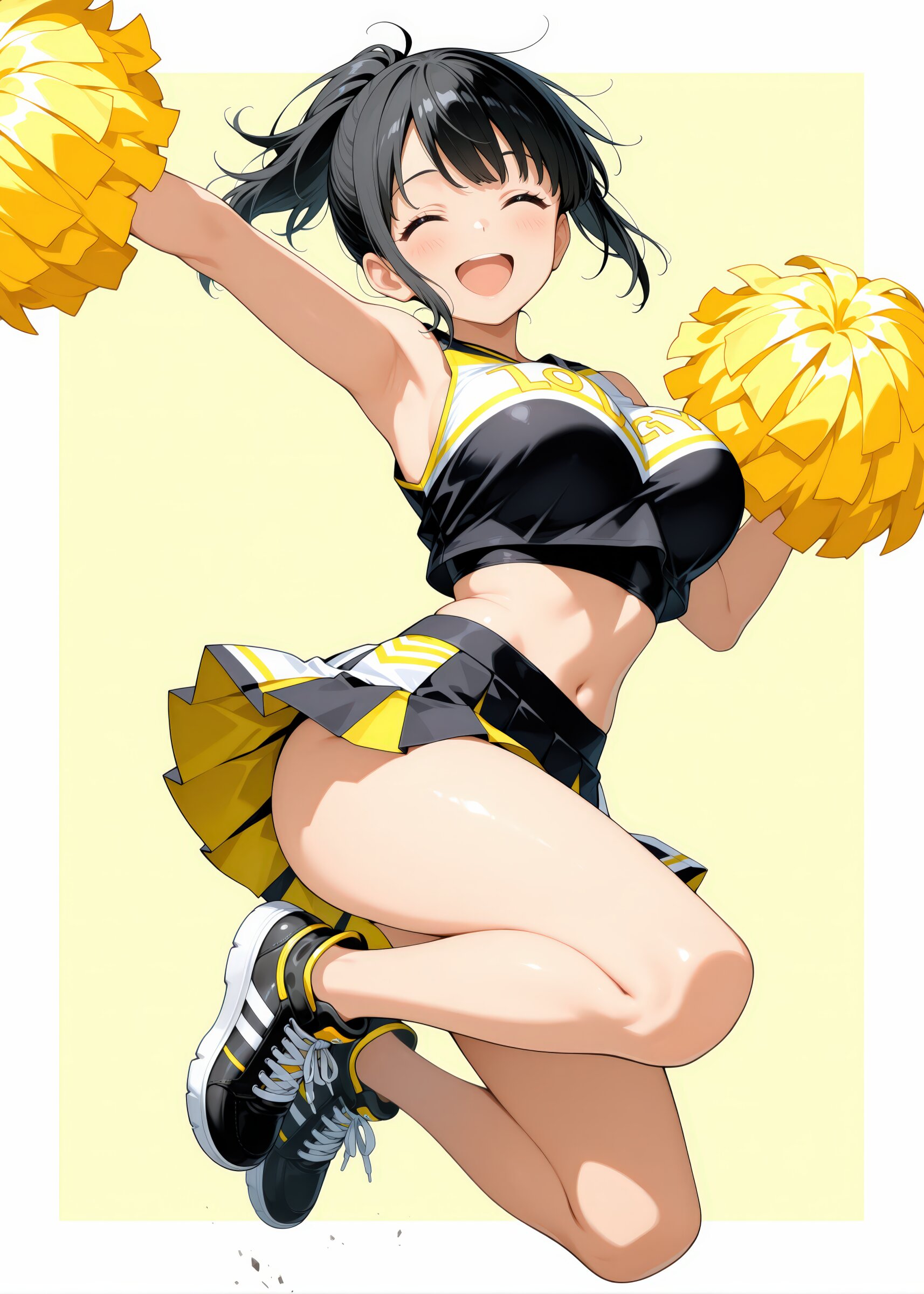 Best quality, Masterpieces, simple background, anime-style illustration, soft yellow background, white background, fine detail, two-tone background, 1girl, (young girl), cute face and eyes, big breasts, black hair, clear black eyes, single short ponytail hair, cute and lovely, Vigorous, lively, and spontaneous personality, happy, smile, open mouth, closed eyes, dynamic pose, jumping, Cheerleader girl, sporty and dynamic, neon yellow and black cheerleader uniform, short crop top, pleated skirt, "GO! FIGHT! WIN!" text on the top, black high-top sneakers, holding black and yellow pom-poms, strong pose, highly detailed, energetic atmosphere