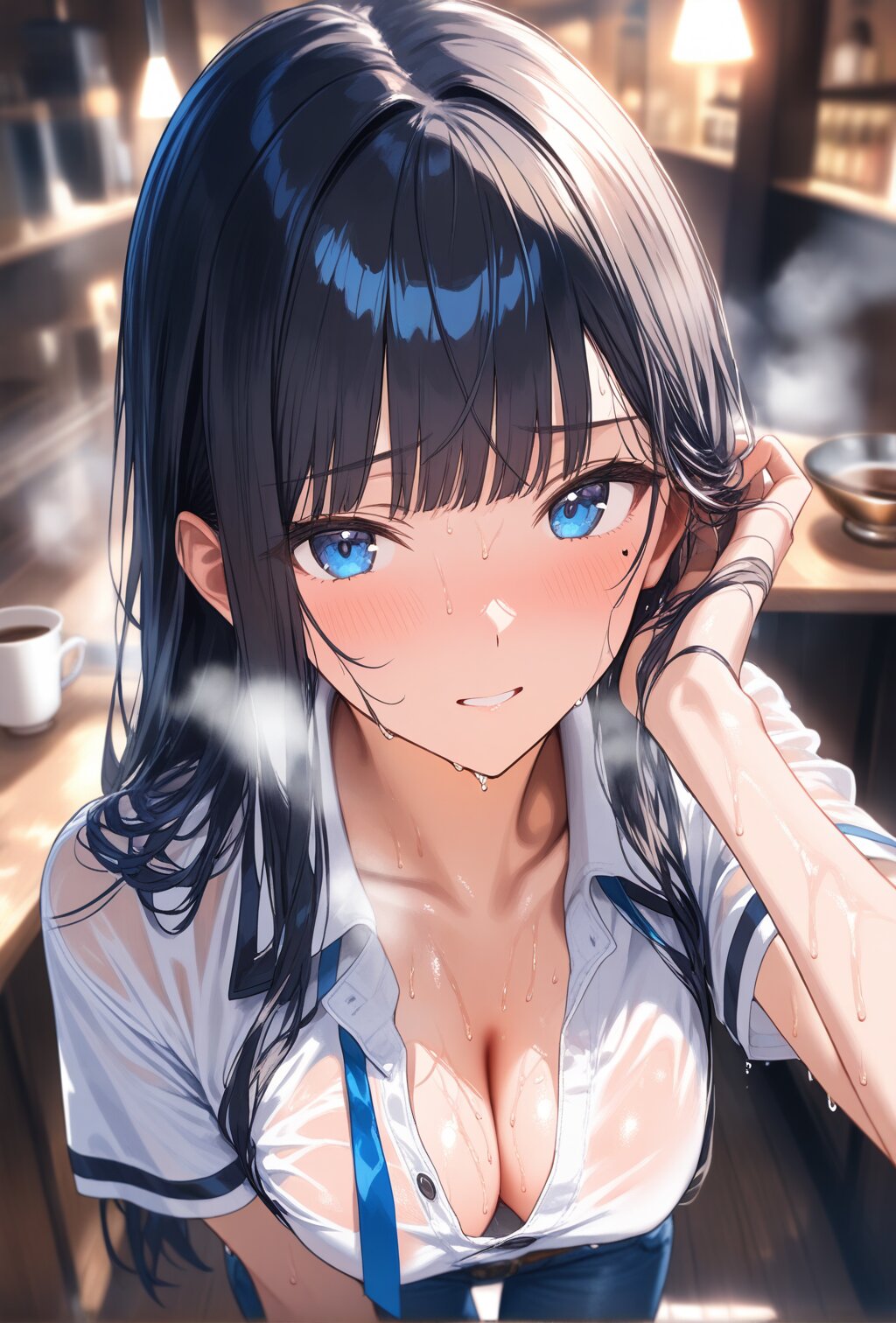 close-up face,perspective,foreshortening, BREAK wet skin,(very sweaty:1.5),sweat,cleavage, BREAK wet,loation,steam, masterpiece,best quality,amazing quality,newest, (real skin:1), coffee house,cafe uniform,white shirt,ribbon tie,jeans pants,, 1girls,masterpiece,best quality,super detail,high details,highres,NSFW, solo,black hair,blue eyes,female,adult,long hair,straight_hair,moles under the left eye,detailed glossy skin texture with shine,