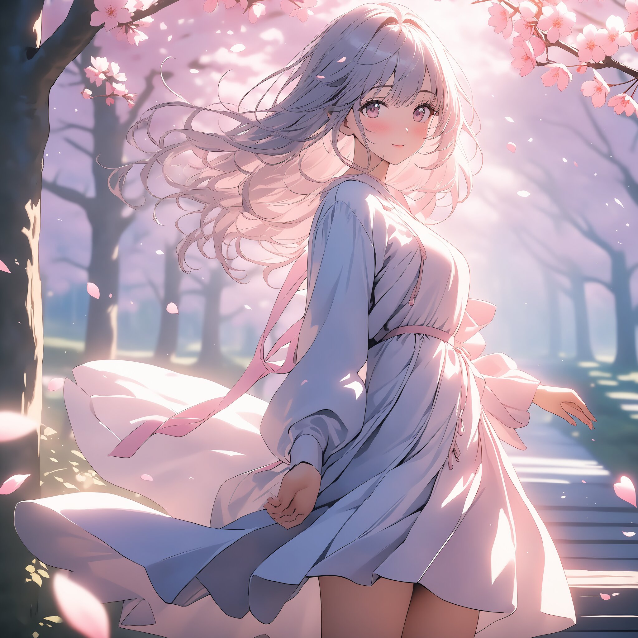 masterpiece, best quality, photorealistic, sharp focus, cinematic lighting, depth of field, beautiful composition, vibrant colors, ultra high res, 8K, highly detailed, masterpiece, best quality, very detailed, Masterpiece, a breathtakingly cute girl standing under a blooming cherry blossom tree, pink petals drifting like snow in the wind, soft spring sunlight filtering through branches, she is looking at the viewer with a gentle smile, hair fluttering in the breeze, ethereal atmosphere, soft pastel colors, cinematic lighting, high quality anime style.