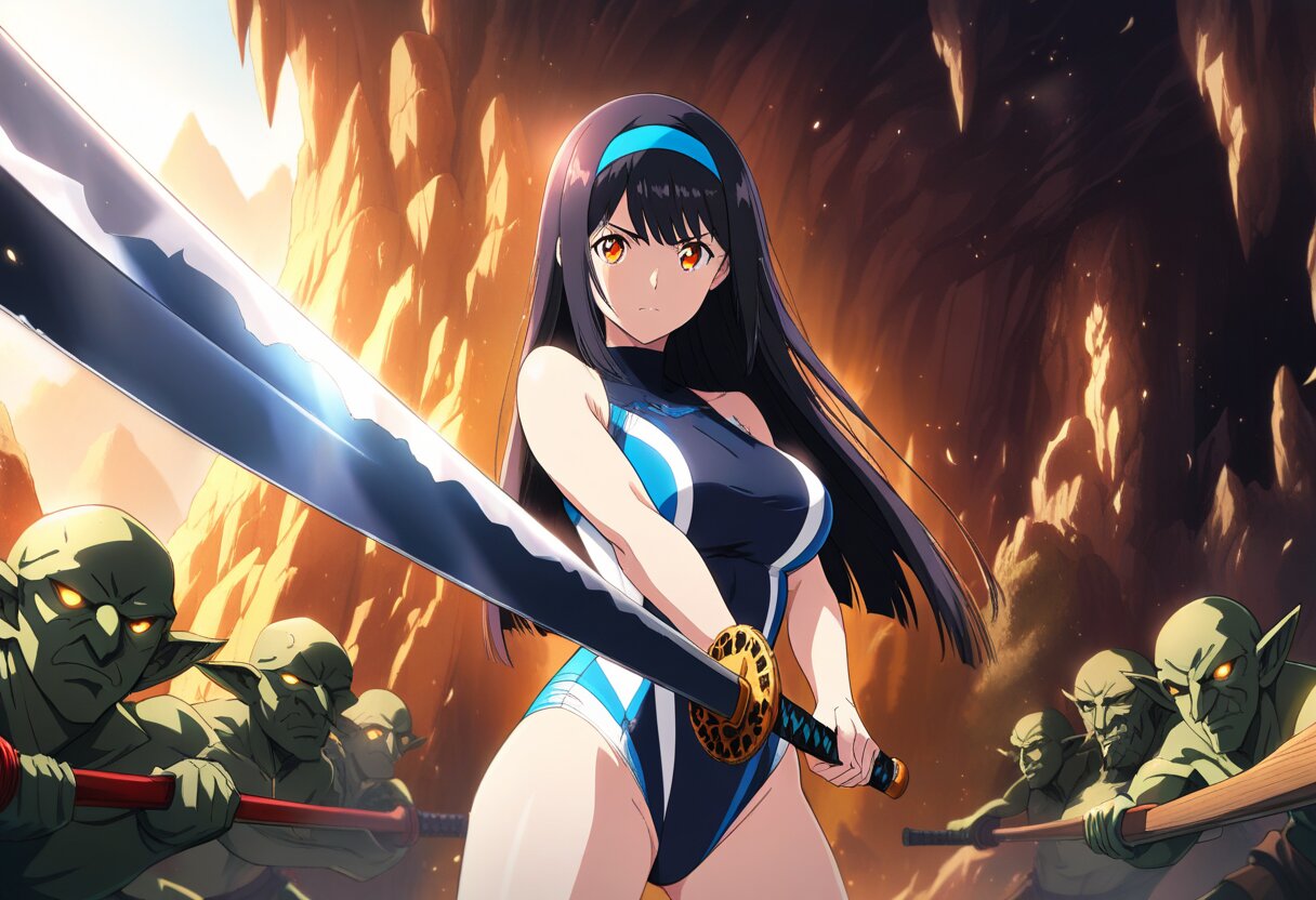 ((masterpiece)), ((best quality)), (ultra-detailed),anime style,cowboy shot, cave, a cute girl, Large bust , torn black Racing-style swimsuit, beautiful black hair, beautiful orange eyes, ((beautiful eyes)),straight hair, (blunt hair), (blue hairband),Holding a weapon in hand, gripping Katana,sunrise stance,serious,Goblin horde