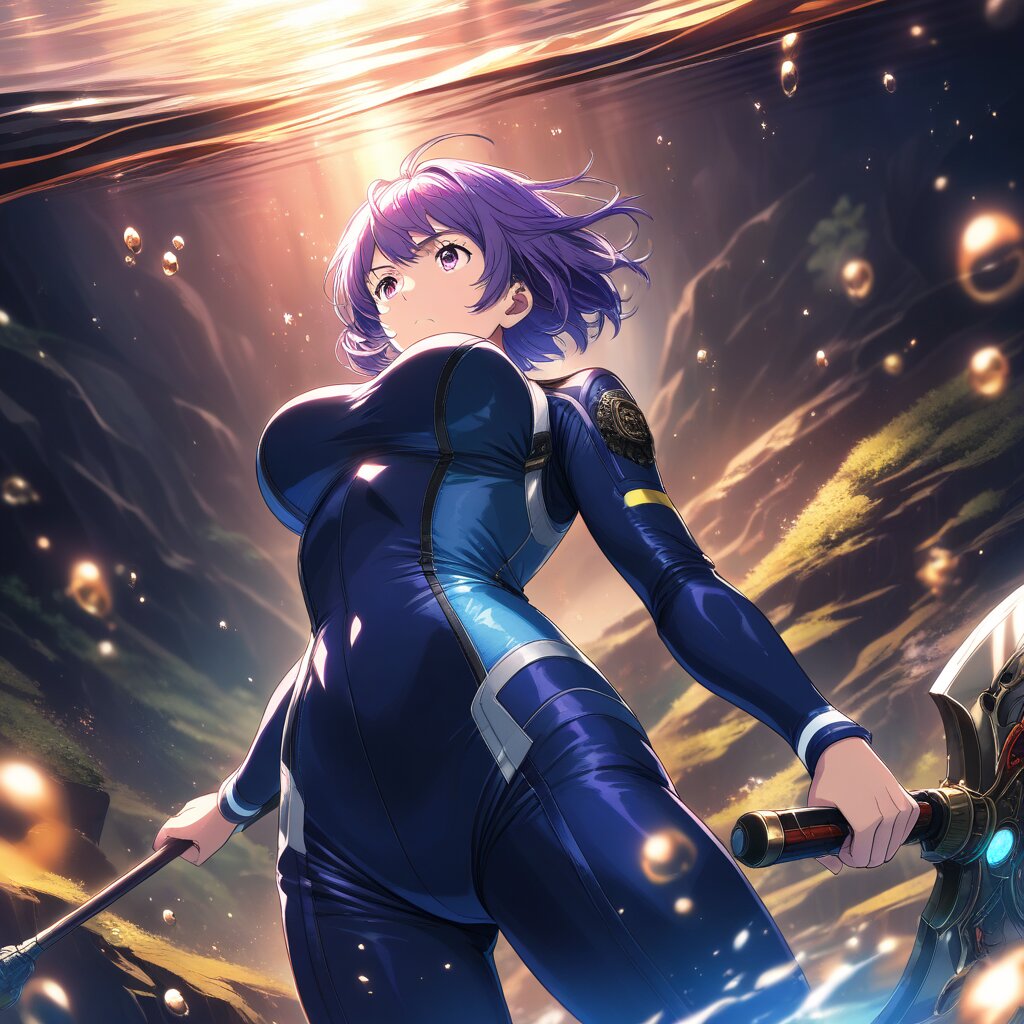 ((masterpiece)), ((best quality)), (ultra-detailed), anime style,cowboy shot,underwater, Deep cave, at dusk,large bust,(navy blue Wetsuit), short hair, purple hair, Holding a weapon in hand, gripping Battle Axe,drifting underwater