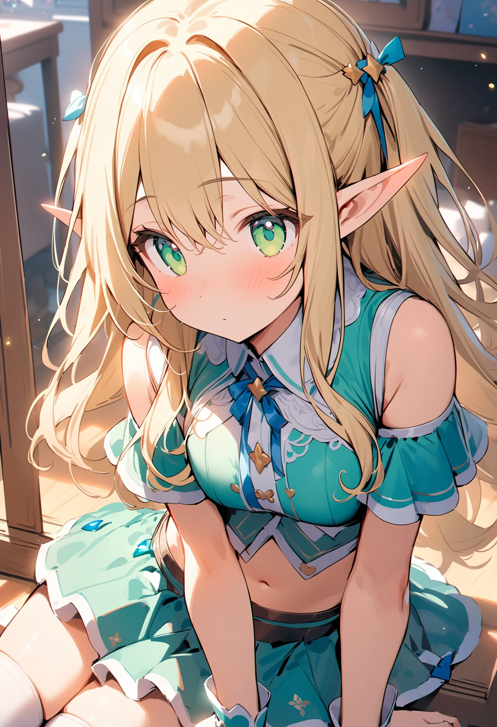 ((masterpiece)), ((best quality)), ((kawaii)), cute, (lovely), ((extremely detailed)), (beautiful), dynamic angle, a cute girl, 1girl, solo, ((elf)),beautiful blond hair, beautiful green eyes, ((beautiful eyes)), long hair, fantasy clothes,