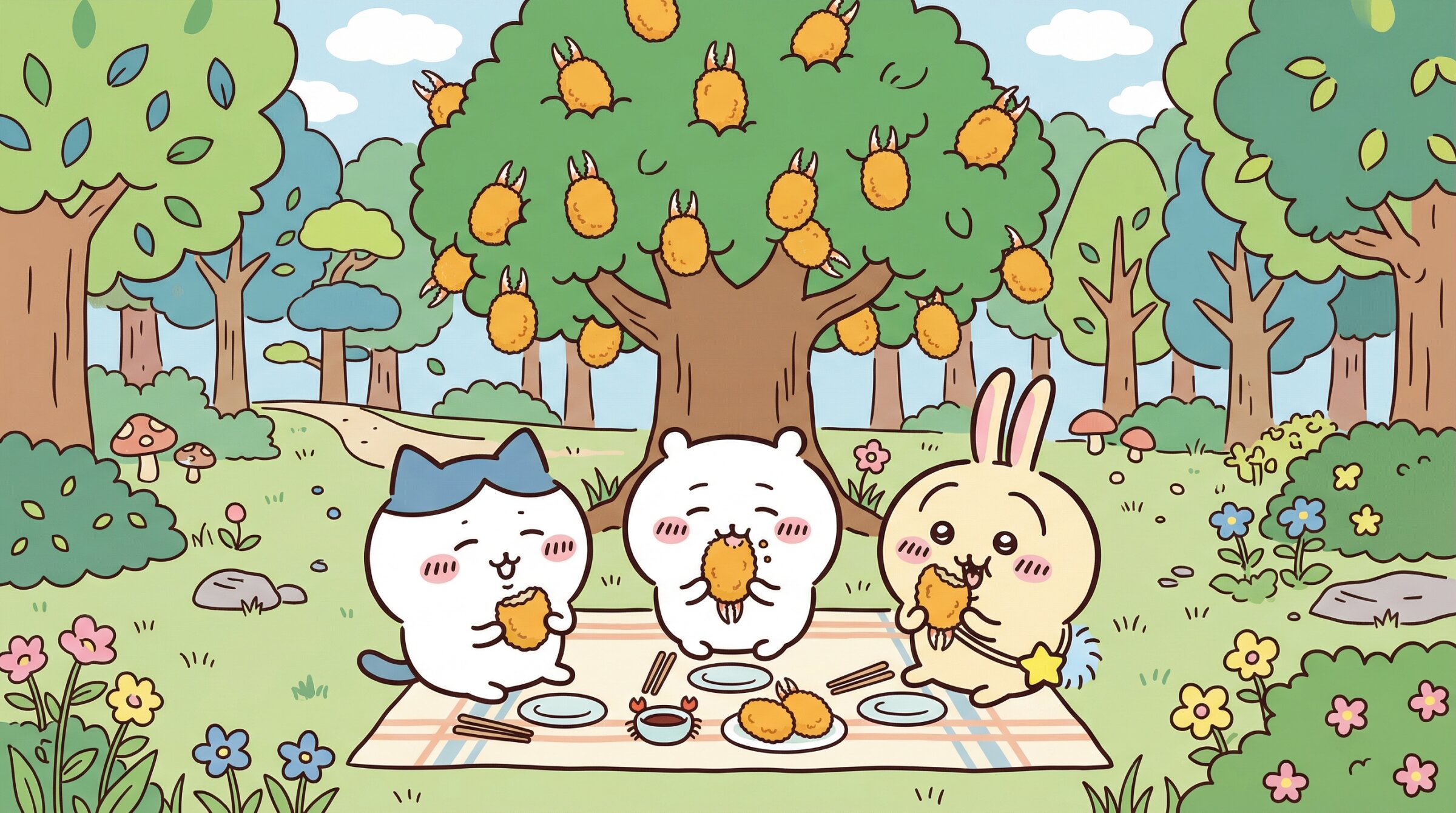 hachiware(chikawa) and usagi(chikawa) chikawa(chikawa) eating crab-craw-korokke forest crab-craw-korokke-tree anime-style 2枚目は、official art flat color を追加