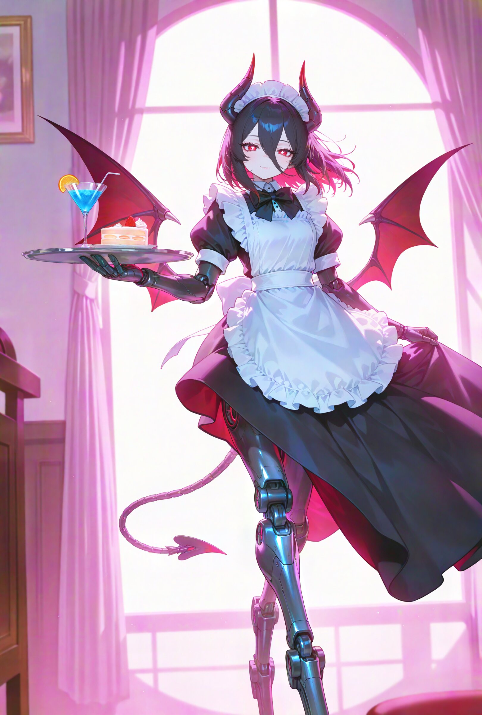 foreshortening, (face:1.3) looking at viewer, maid cafe, cyberpunk, An android woman works at a maid café. The café has a fantasy theme where she works as a classic maid, pretending to be a demon from a fictional country. indoor, A modern design with a sharp impression The space is white-based and sophisticated Simple interior style, Step inside and you’re transported into a world fit for a traveller White lace curtains serve as dividers, round window, (white lace curtains:1.0), creating intimate spaces, illuminating the meticulously crafted space meticulously crafted. maid, pale skin, black hair, medium hair, husky hair, long bangs, red eyes, (beautiful x-shaped pupils:1.0), (intricate mechanical legs:1.2), prosthetic hands,, mechanical arms, short sleeves classic maid uniform, black bowtie, long skirt, maid headdress, maid apron, demon horns, demon tail, demon wings, empty eyes, seductive smile, , half closed eyes, closed mouth, shrug, mechanical tail, beautiful blue cocktail glass on tray super fine concept art, hard surface, 8K, unreal engine, beautiful mechanics, masterpiece, best quality, amazing quality, very aesthetic, absurdres, you can add scenery, (volumetric lighting), To make the background more distinctive. professional art lots of details, , overexposure, shiny-glistening, (watercolor style:0.0), (pastel color style:1.0) <lora:noline (1):-0.5> <lora:sdxl2-flat2-512b:-0.5> <lora:facelightup_xl_v10:0.5>