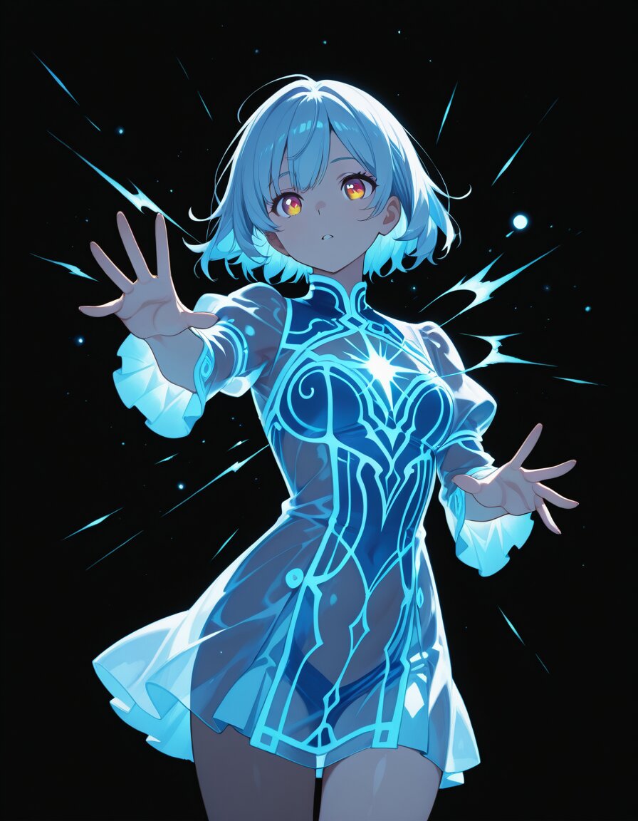 best quality, beautiful, 8K, intricate details, detailed hands, (five fingers, natural pose, distinct fingers, detailed face:1.2), highly detailed eyes, (Anime style:1.2), solo, a girl, (transparent dress:1.5), black background overwhelming luminous aura dominating the scene, dense glowing particles filling the frame, light scattering in the air, overexposed glow, bloom, high contrast lighting, radiant mist, cowboy shot