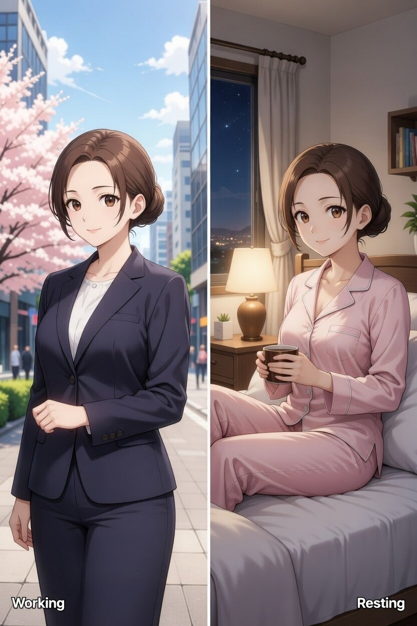最初のプロンプト A digital illustration of a young Japanese woman in a business suit, set in a modern Tokyo spring scene. 次のプロンプト このキャラクターのまま、夜に自室でパジャマ姿でくつろいでいるイラストにしてください。 最後のプロンプト 1枚目の働いている状態と、2枚目の夜の休んでいる状態を対照的に配置したイラストにしてください。