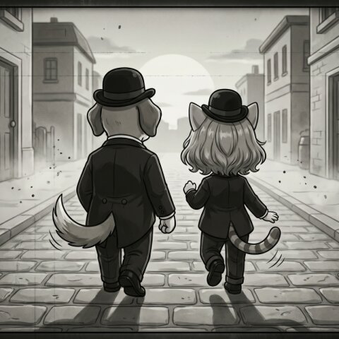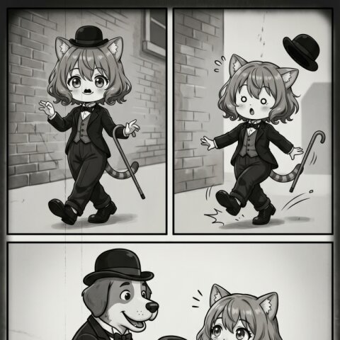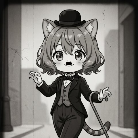 Use the uploaded image as the absolute visual reference for the character's face,ears, and natural cat tail. Do not deviate from the original design. ドヤ顔でビスケットを嗜むシーン。 薄暗いムードのあるバーカウンターで グラスに入ったミルクにビスケットを少しつけている。 セリフはすべて日本語。 シチュエーションに沿った衣装。