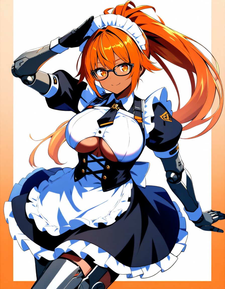1girl, solo, (dark skin:1.2), orange hair, ponytail, orange eye, large breasts, black-framed eyewear, tactical maid, french maid, maid, maid headdress, white shirt, framed breasts, black puffy sleeves, black skirt, white waist apron, frilled apron, black short necktie, underboob, underboob cutout, mechanical arms, doll joints, mechanical legs, mechabare, smile, salute, masterpiece, best quality, high quality, absurdres