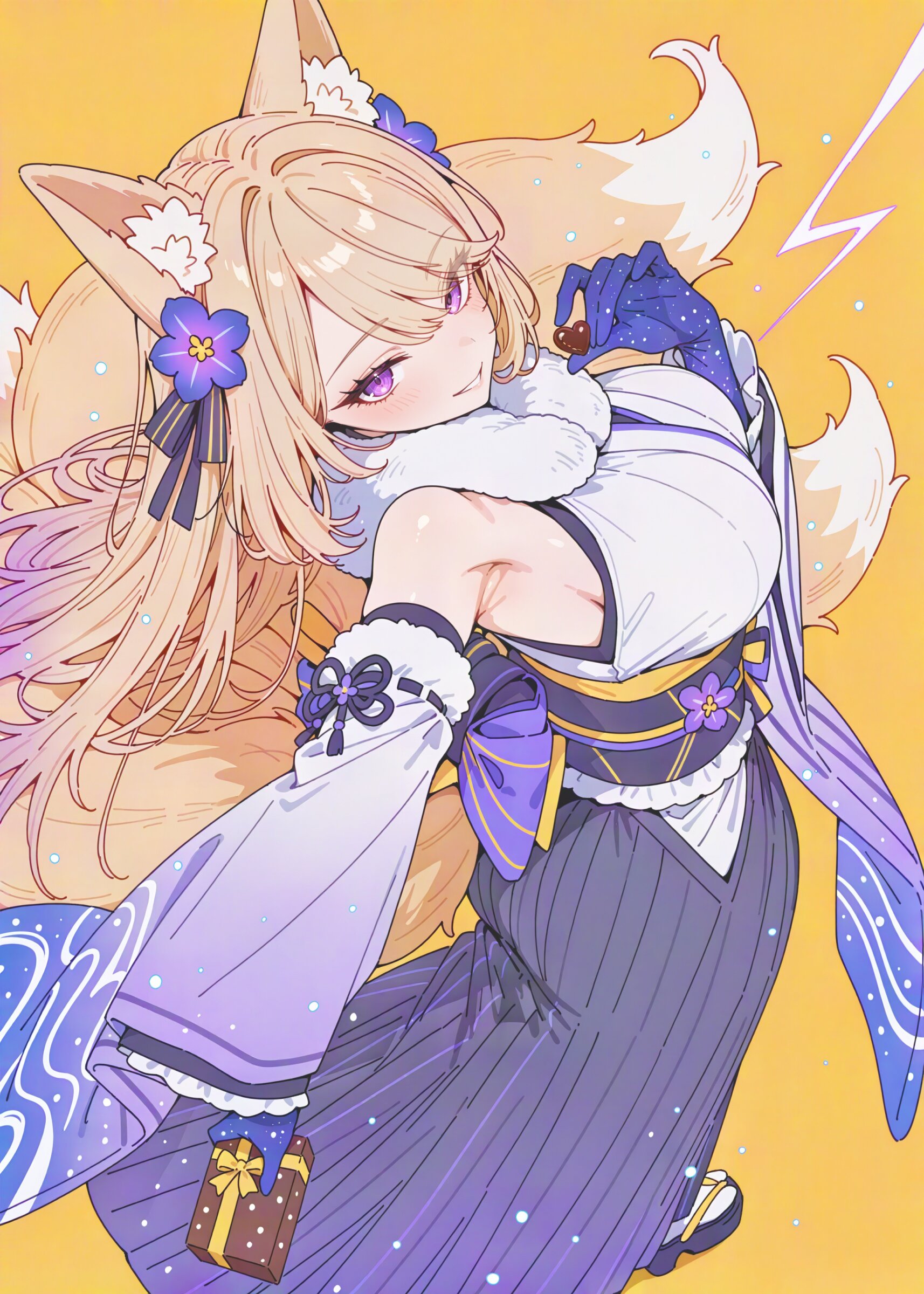 from behind, looking back, high angle shot, looking up, (close to viewer:1.2), knees out of frame, , looking at viewer, (simple light colorful buttercup yellow background:1.1), drop shadow, colored shadow, The background is a solid, bright colorful buttercup yellow, creating a striking contrast with the intricate, multi-colored design of the character, (ink wash effect:0.9), pop color background, (high saturation:1.2), winter coloring, winter atmosphere, 1girl, fox girl, gold Blond Hair, large breasts and fox ears, (swept bangs:1.2), (perfect purple eyes:1.3) long eyelashes aristocratic features tall girl has (Blond Hair long hair over ears:1.3) fox 9tails, (wearing White Japanese Cloth straw sandal precise silk gloves long skirt Obi boots:1.3), hair ornament flower, tabi, winter scarf, (fur trim:1.1), black thighhighs, detached sleeves, mysterious atmosphere, seductive smile, doyagao, holding chocolate, gift box, ribbon armpits, colorful buttercup yellow theme, super fine concept art, 8K, graceful eyes, masterpiece, best quality, amazing quality, very aesthetic, absurdres, newest, professional art lots of details, , overexposure, sumie effect style, 4ur4_illu,shiny, glowing, glowing particles, glowing light particles, light particles, lightning strike, <lora:noline (1):-0.5> <lora:sdxl2-flat2-512b:0.2> <lora:facelightup_xl_v10:0.5> <lora:V2_yakumo_alchemy:0.5> <lora:Aura_illu:0.1>