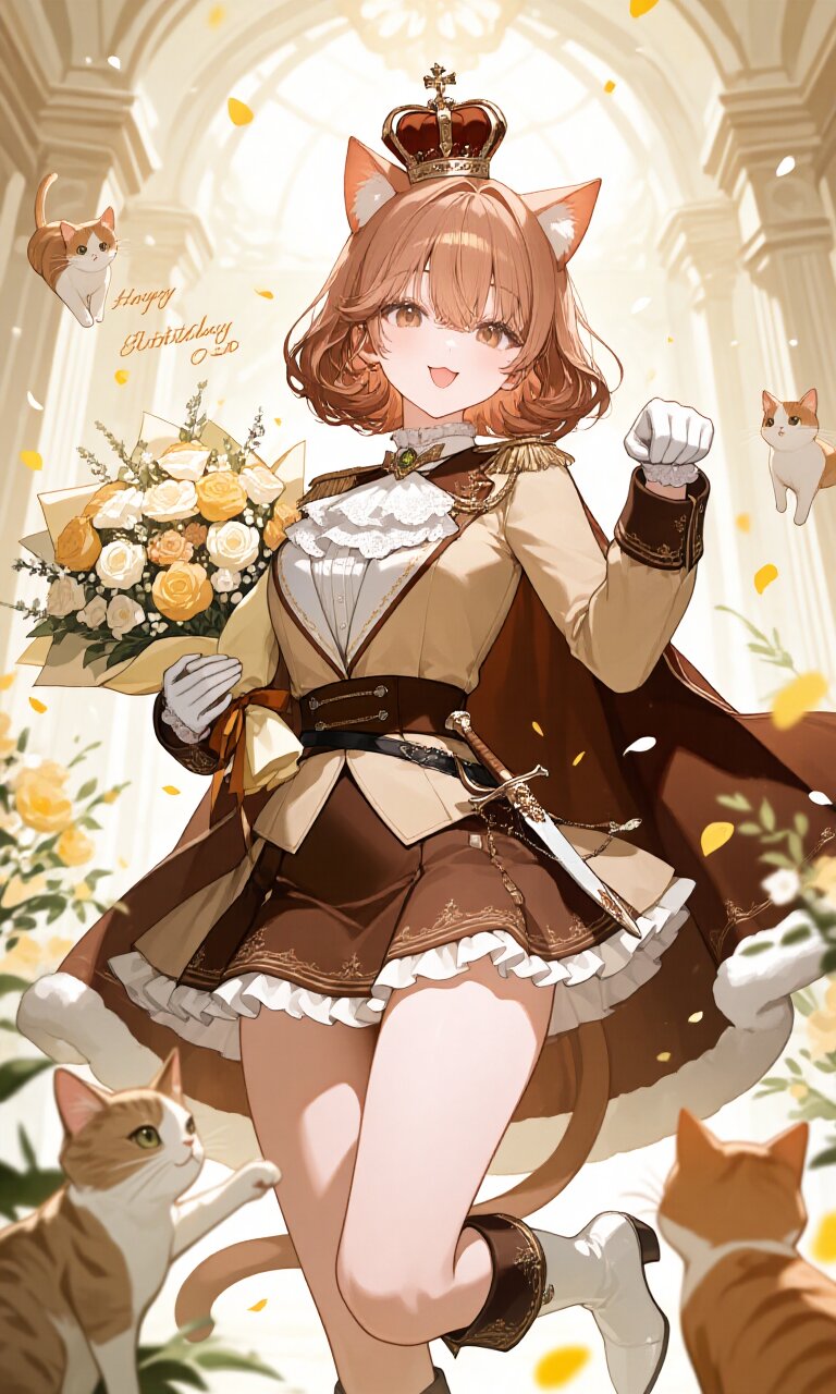 1girl, solo, a 20-year-old female with pastel brown cat ears and a natural cat tail peeking from under her (luxurious brown mini skirt with white frills:1.3). She has calm brown eyes and pastel chestnut brown wavy bob hair with loose inward curls, featuring strands between her eyes. Her face is detailed with a cute expression, half-open mouth in a :3 smile, and a happy, cheerful demeanor. She wears a (beige luxurious Prince costume:1.5) with long sleeves, a white lace jabot, and (luxurious white gloves:1.2). Her attire includes a (luxurious chocolate-colored cape:1.4), (white luxurious boots:1.3), and a (dagger on waist:1.3). A (luxurious crown on head:1.3) completes her princely look. She strikes a cute paw pose while (holding a bouquet in hand:1.8) in a heartwarming birthday scene. The setting is a (Palace:1.2) ballroom with (Baroque architecture:1.2), surrounded by lots of flowers and (surrounded by cute kittens:1.8). The atmosphere is dreamy, light, and romantic academia, with soft lighting and a bloom effect enhancing the scene. The style is insanely detailed, masterpiece quality with beautiful 16K resolution, focusing on intricate textures of her clothes, skin, and hair.