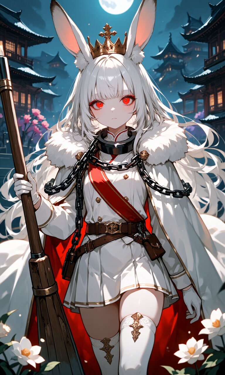 1girl, solo, anthropomorphic rabbit girl, petite, small stature, short girl, white fluffy rabbit ears, long flowing white hair, piercing red eyes, pale skin, detailed beautiful yet terrifying eyes, predominantly white with red accents. She wears a thick heavy metal chain diagonally from right shoulder to left hip (like a tasuki sash), with a large iron chain draped over her shoulder. A brown leather belt with a large buckle cinches her waist. Her expression is blank, with a delicate face, detailed skin, and meticulously rendered hair. Dressed in a (White luxurious Prince costume:1.6) with long sleeves, a (luxurious White Cape:1.3), a (luxurious White mini skirt:1.4), (luxurious White Thighhighs:1.3), and (luxurious White gloves:1.3). At her waist rests a (massive wooden boat oar:1.3), textured with visible grain and wear. A (luxurious crown:1.4) sits atop her head. The setting is a grand palace with Japanese traditional architecture, bathed in moonlight with a mystical atmosphere. Outside, Japanese flowers bloom under the night sky, illuminated by soft rim lighting. The composition blends romantic and classic academia aesthetics, with an insanely detailed, masterpiece-quality rendering of textures—fabric, metal, wood, and skin—all under a dreamy, ethereal glow.