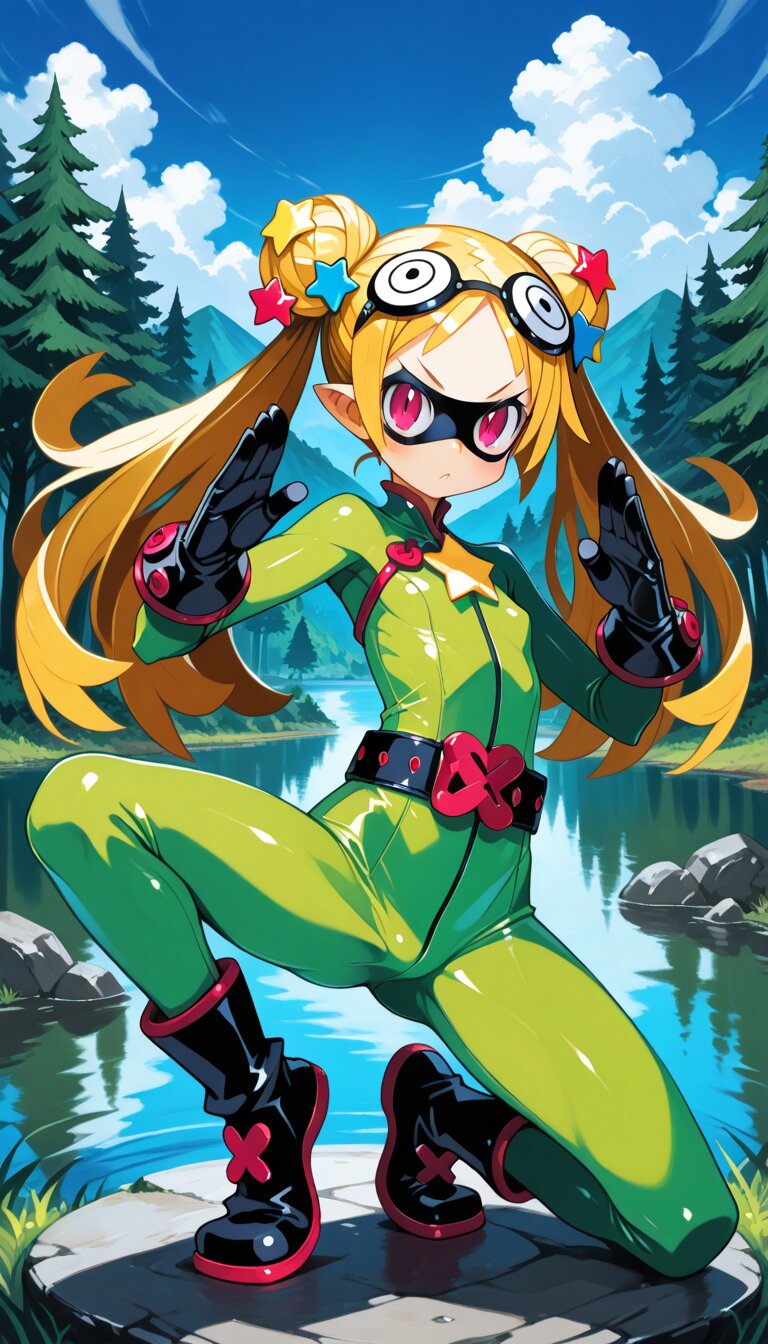 (harada takehito,Disgaea Style:1.2), looking at viewer, gloves, bodysuit, green bodysuit, belt, googles, domino mask, googles on head, BREAK Lots of hair ornaments,tons of hair clips, star heart candy hair pins, neon plastic barrettes, kung fu, martial arts, training, fighting stance, forest, fields, clouds, lake,
