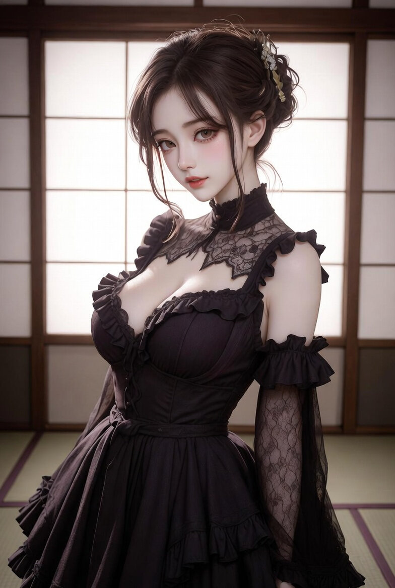 日本人女性23歳のリアルなイラスト。プロのカメラマンによる撮影。ゴシックロリータのダークな衣裳を身につけている。日本の和室にいて、明るい障子窓のそば。表情はおすまし。
