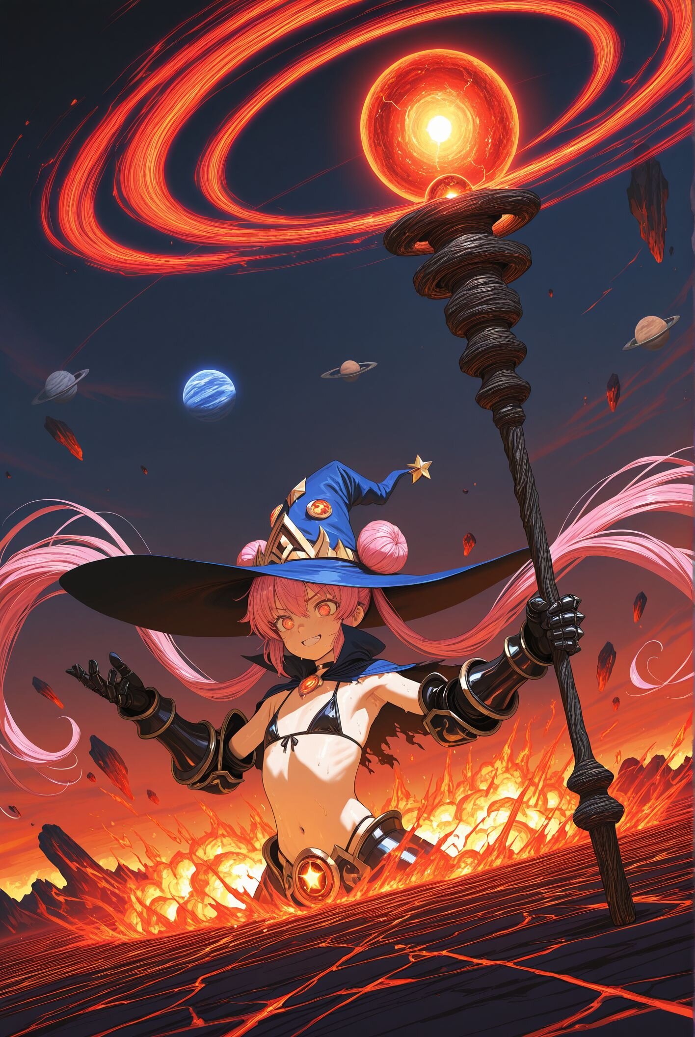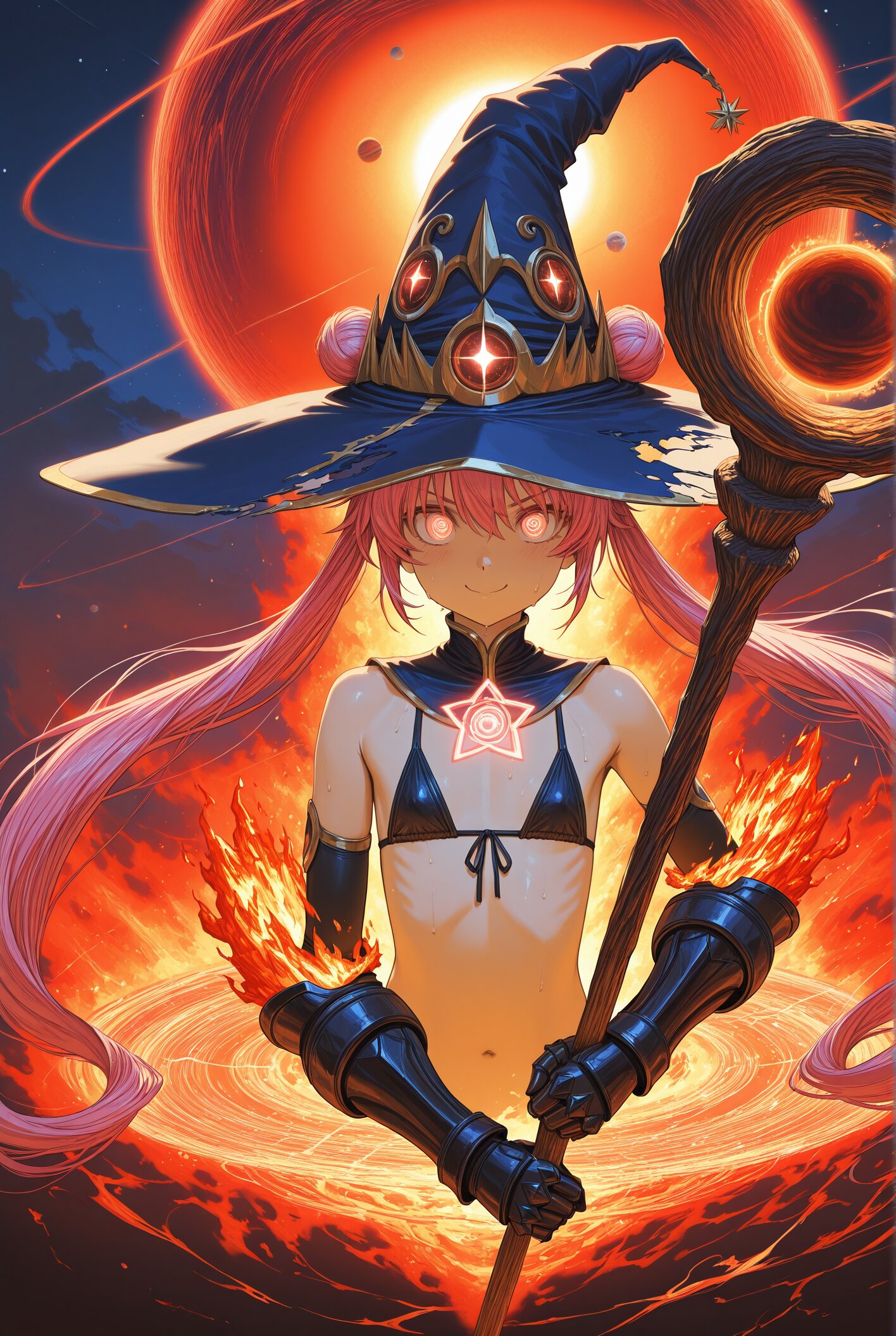 (huge staff:2.2),(flat chest:1.5),(damascus steel pattern:1.2),(etched layered steel texture),(calm smile:1.2),(huge wizard hat:1.8),(upper body:1.7), (absurdly long pink hair),(grenn eyes:1.5),(high bun twintail:1.6), (upper body1.5), (micro bikini), (thong),(huge heavy gauntlets:2.2), (sweat:1.3), (Wizard:1.8), very aesthetic, amazing quality,(dynamic angle:1.4),(dynamic pose:1.4), <lora:StS-Illustrious-Detail-Slider-v1.0:2.> <lora:sdxl-hairdetailer_02:2> ultimate forbidden spell meteor, sky torn open, colossal flaming meteors descending from orbit, planetary scale impact, continent sized fireballs, sky cracked with glowing magma fissures, cosmic energy vortex, thunderous shockwaves, blinding light,