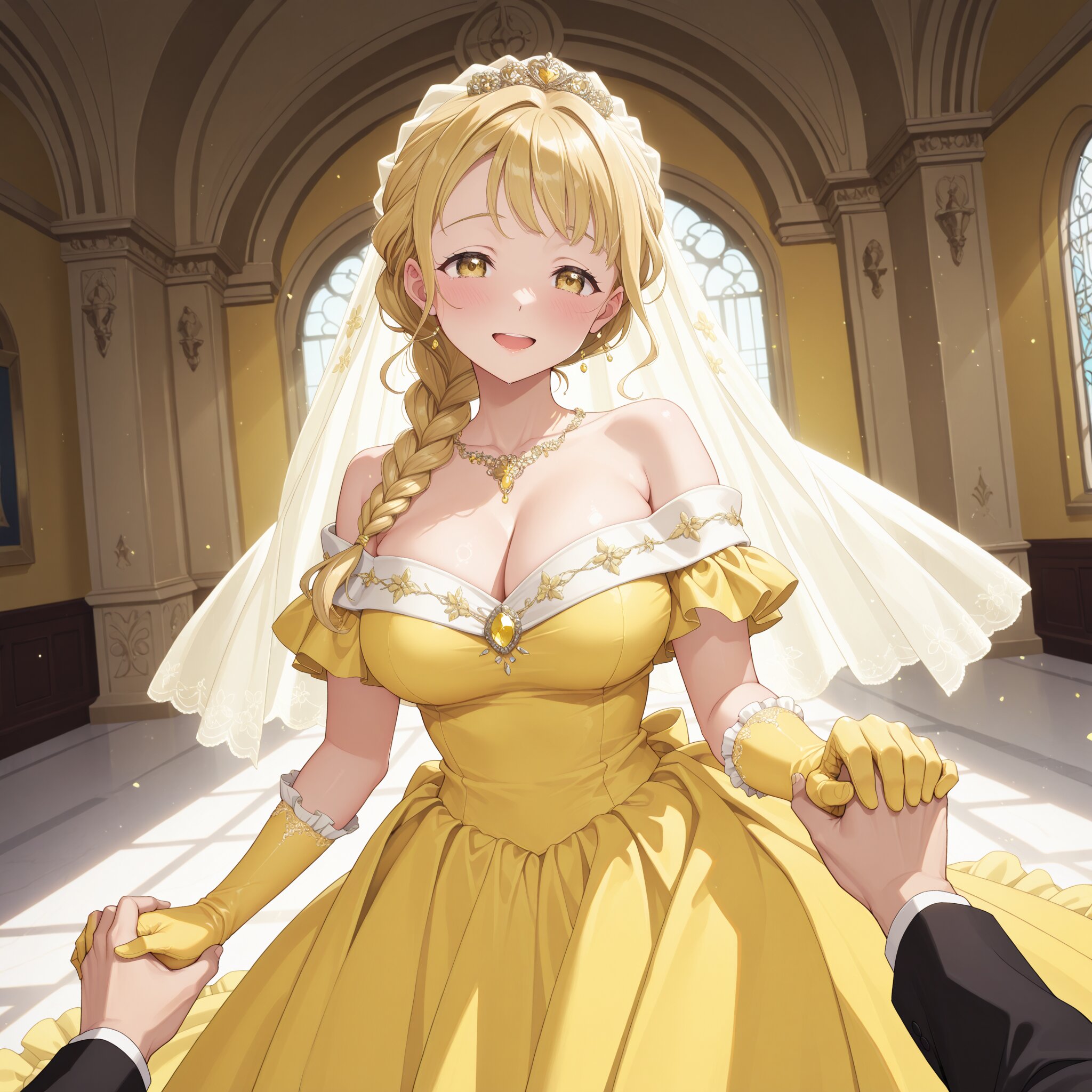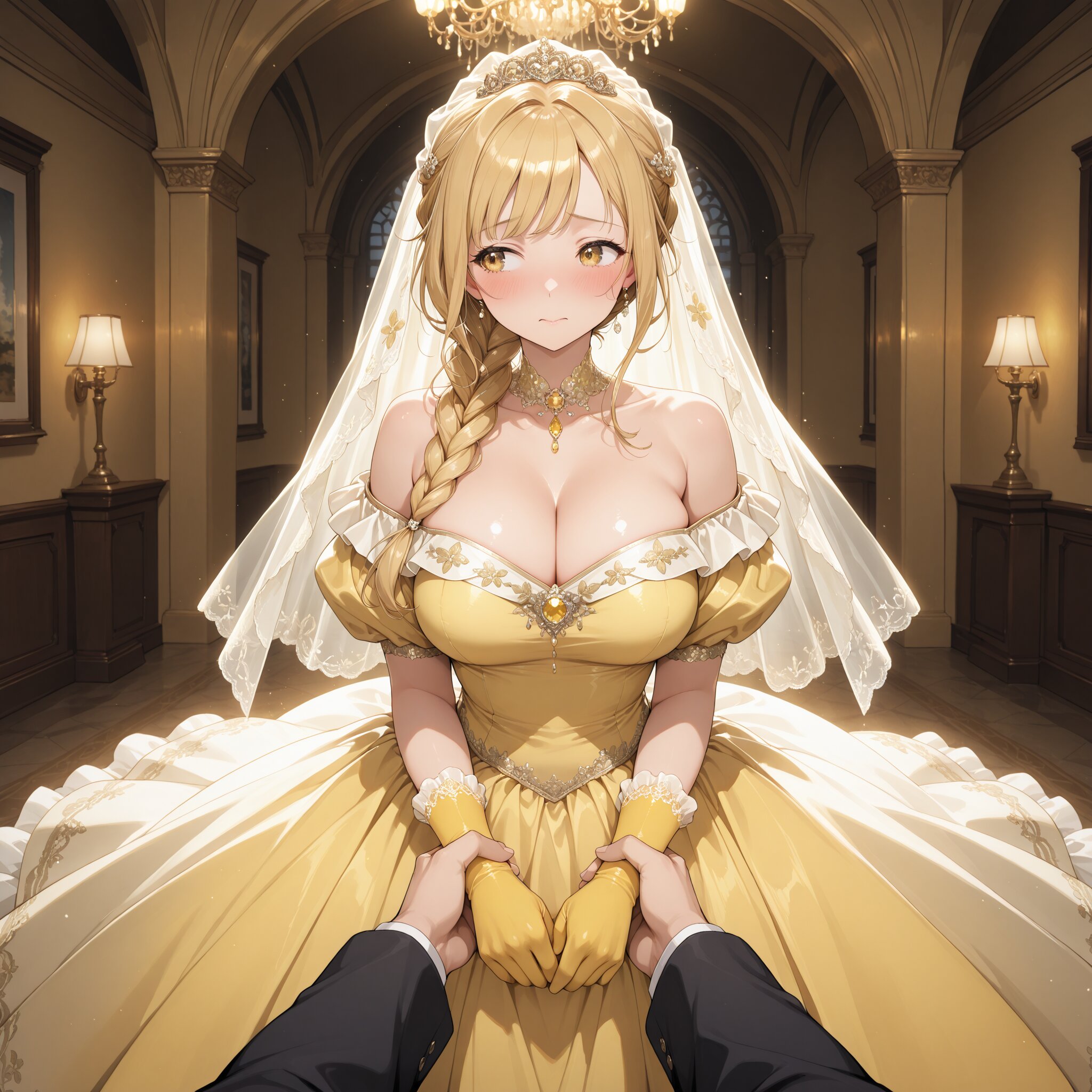 Masterpiece, highest quality, stunning quality, very beautiful, intricate skin detail, captivating high resolution, exquisite detail, 8K, extreme expression (beautiful large breasts), beautiful woman, hairstyle (blonde, single braid, with bangs), yellow dress (princess line, off-the-shoulder, with ample ruffles at the hem), long yellow wedding gloves, full view of woman, facial expression (shy, looking away), background (a very large palace room), only one woman in view, point of view, POV shot, yellow wedding veil, full dress composition, hands held in front, cinematic lighting, Dutch angle