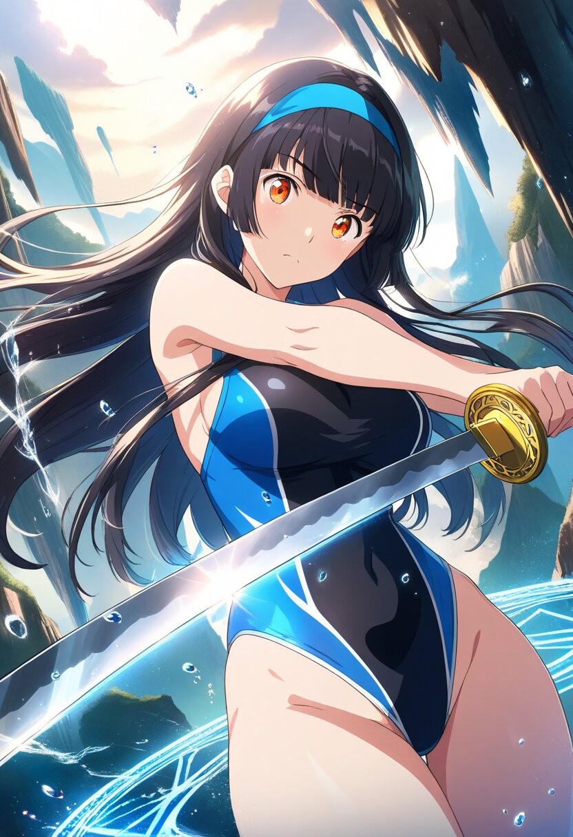 ((masterpiece)), ((best quality)), (ultra-detailed),anime style,cowboy shot, cliff, stalactites, water droplets, a cute girl, 1girl, large bust, ((Black Racing-style swimsuit)), beautiful black hair, beautiful orange eyes, ((beautiful eyes)),straight hair, (blunt hair), ((blue hairband)), Holding a weapon in hand, gripping katana,dynamic pose,dynamic angle, magic circle,Jumping