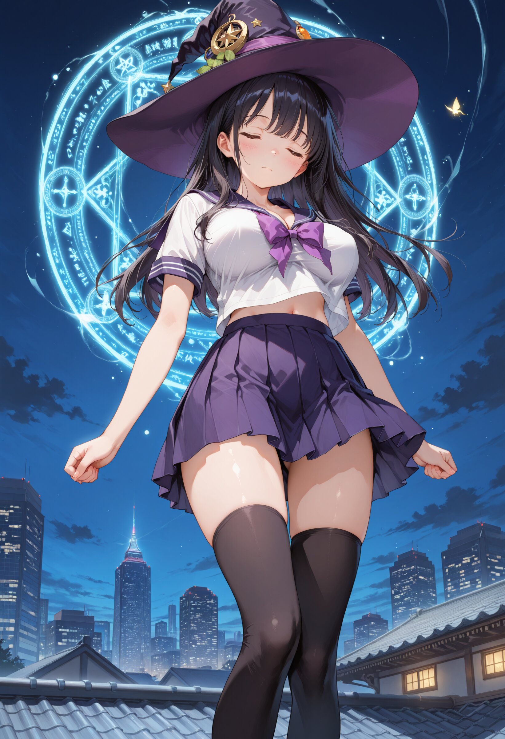 masterpiece, best quality, amazing quality, general, fine detail, official art, 1girl, Floating in the air, loli, petite, school sailor uniform, purple sailor collar, white sailor shirt, short sleeves, purple miniskirt, witch hat, cleavage between sailor collar, midriff peek, black thigh-high socks, beautiful black hair, closed eyes, beautiful legs, big breasts, impossible clothes, perky breasts, , Skyscraper, rooftop, night, shining building lights,, innocent expression, magic circle, Cast a spell, dynamic pose, from below,